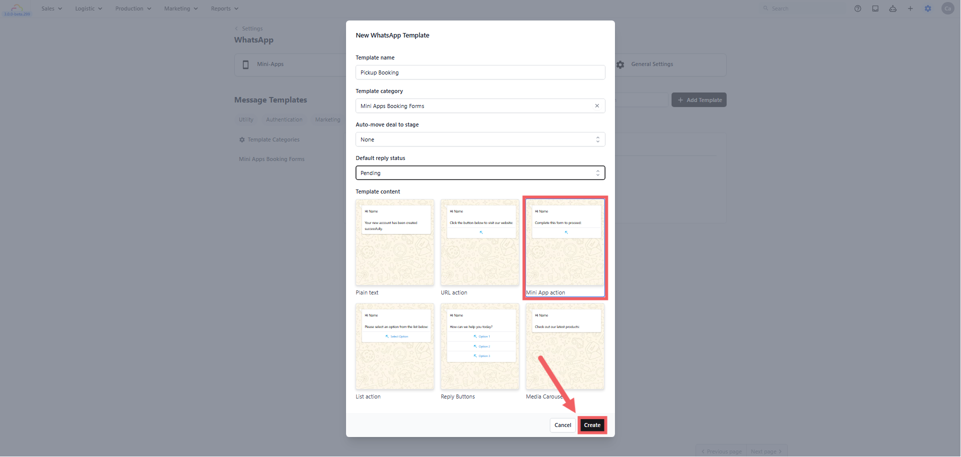 - Under Template Content, click the Mini App action card, then click Create.