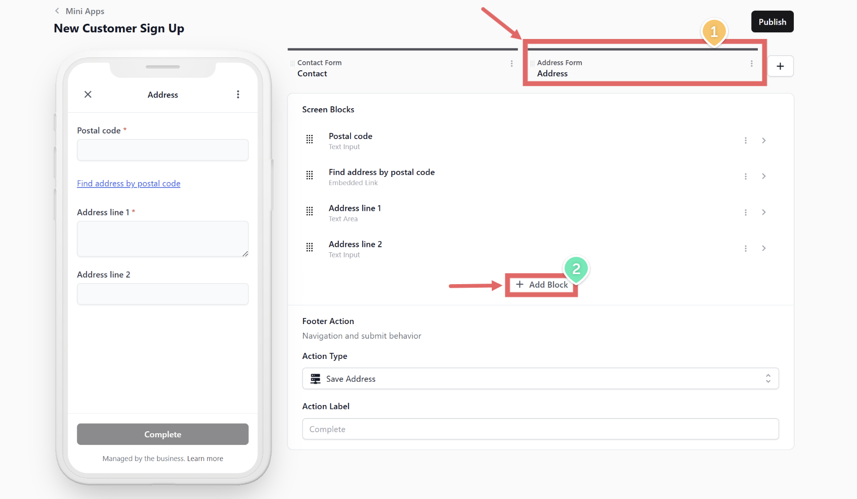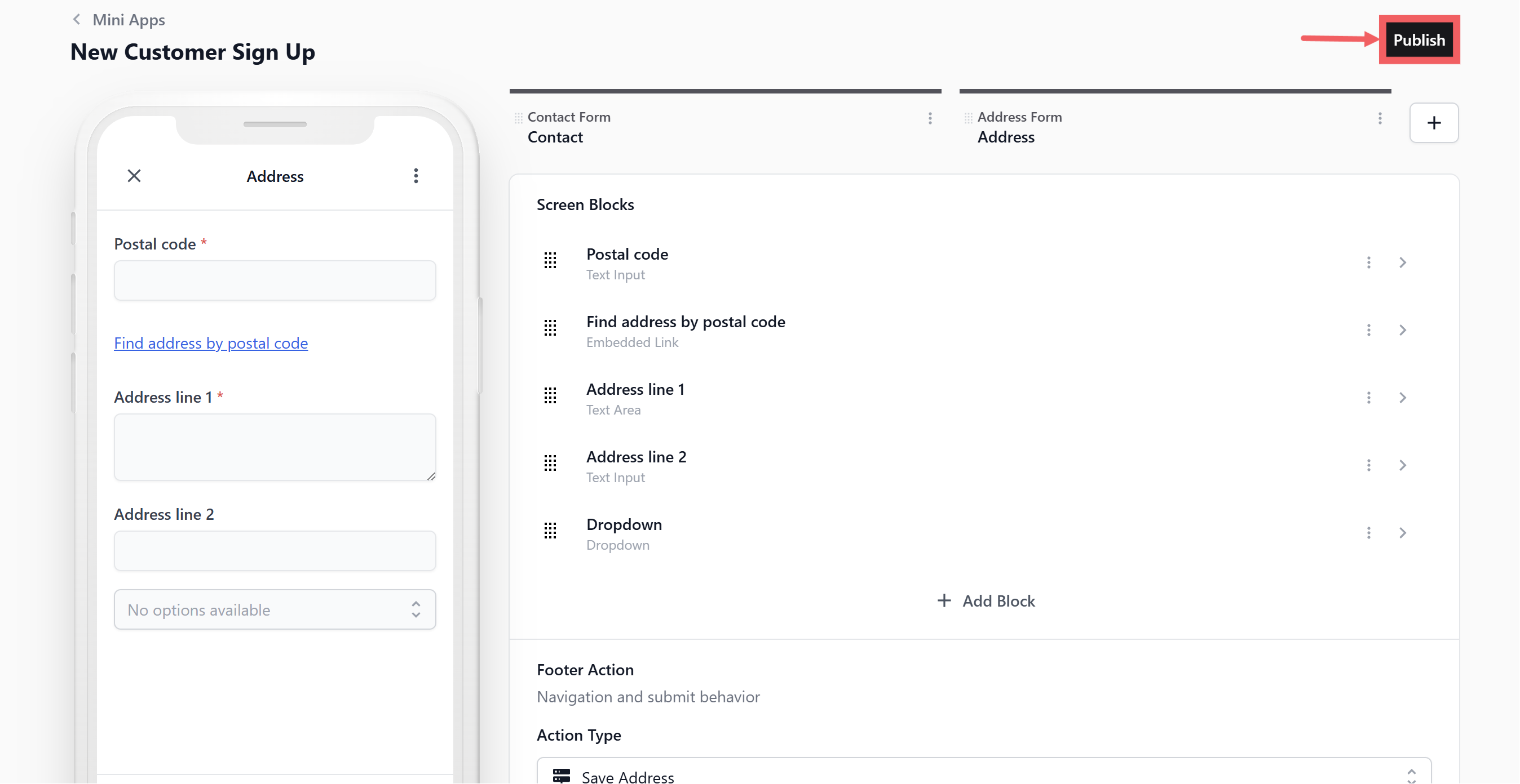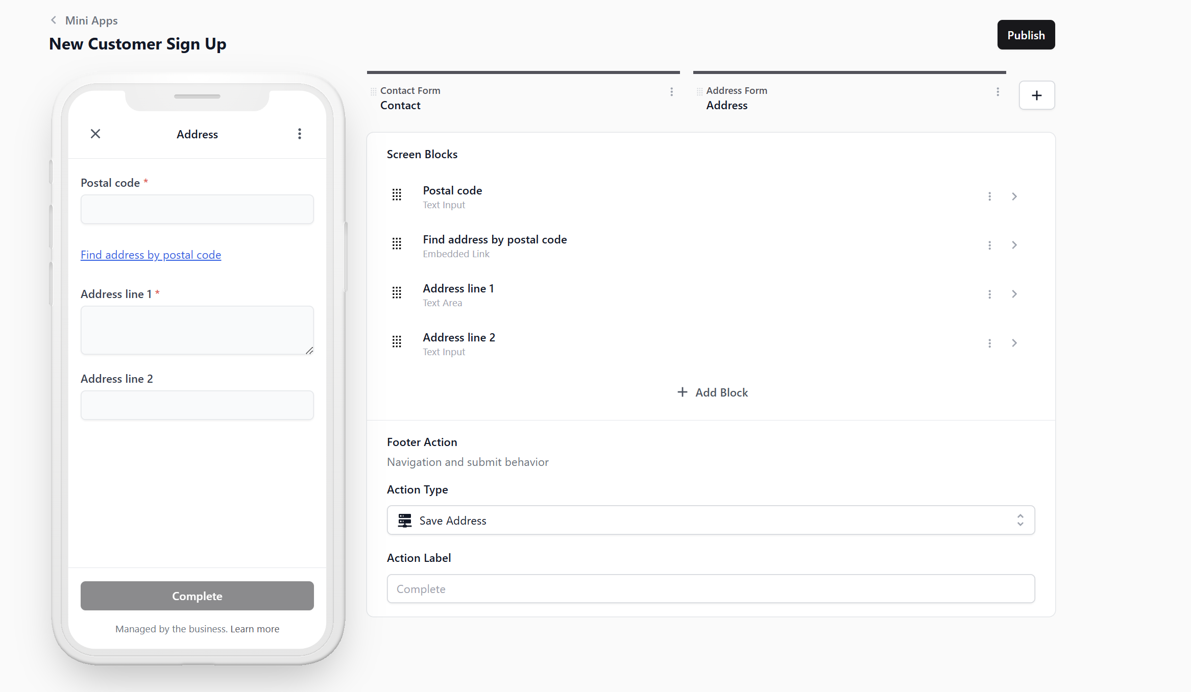 - Back in your Mini App editor, click your Address screen tab.
