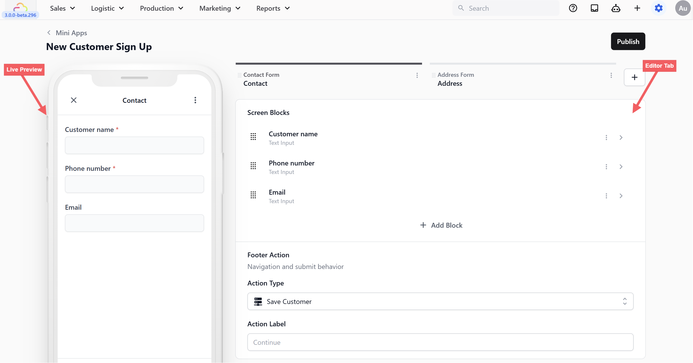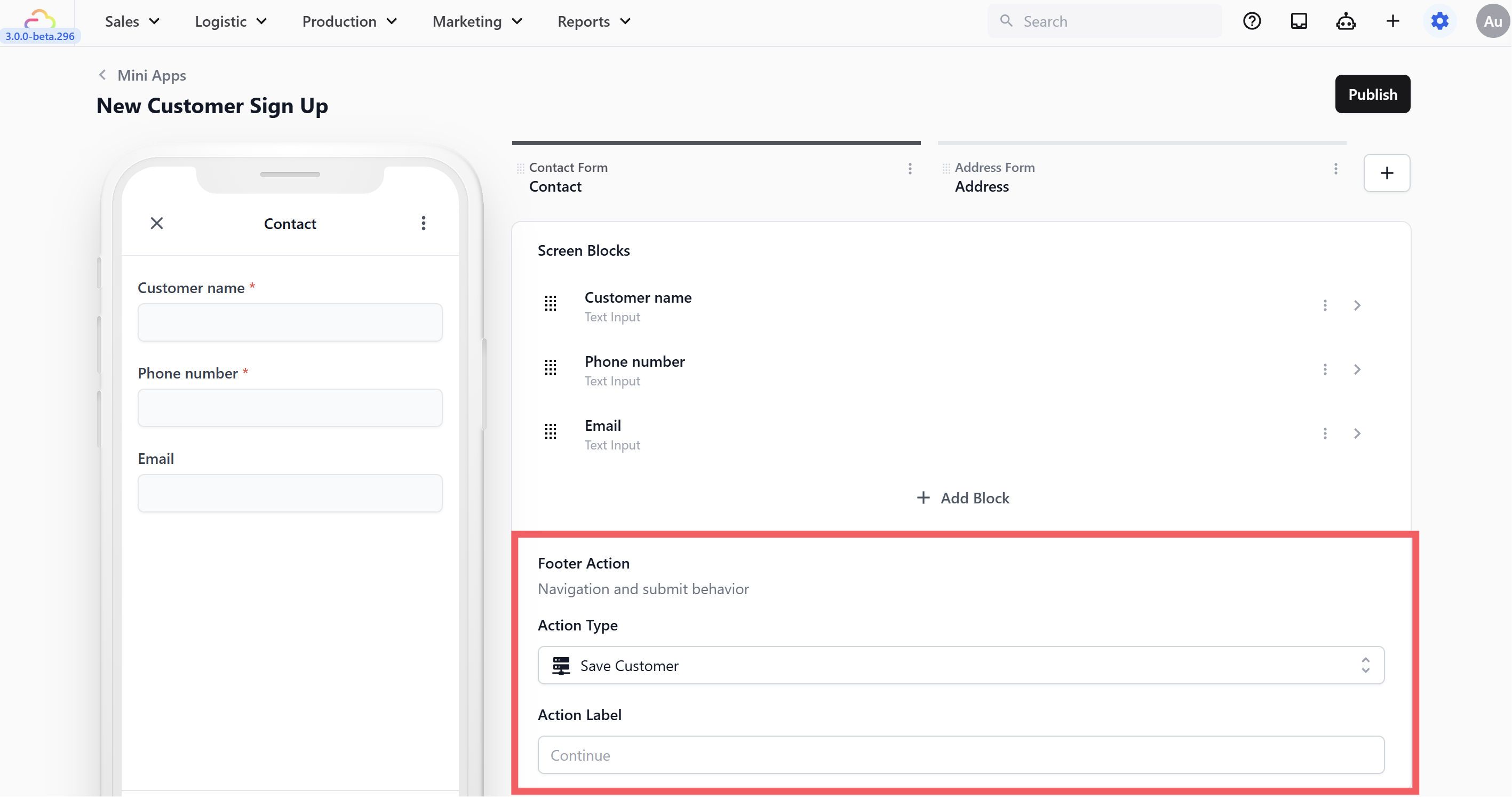 At the very bottom of the editor for each screen, you will see a Footer Action. This controls what the button at the bottom of the customer's phone does when they tap it. It might tell the app to save the customer's details, move to the next page, or finally create the order.
