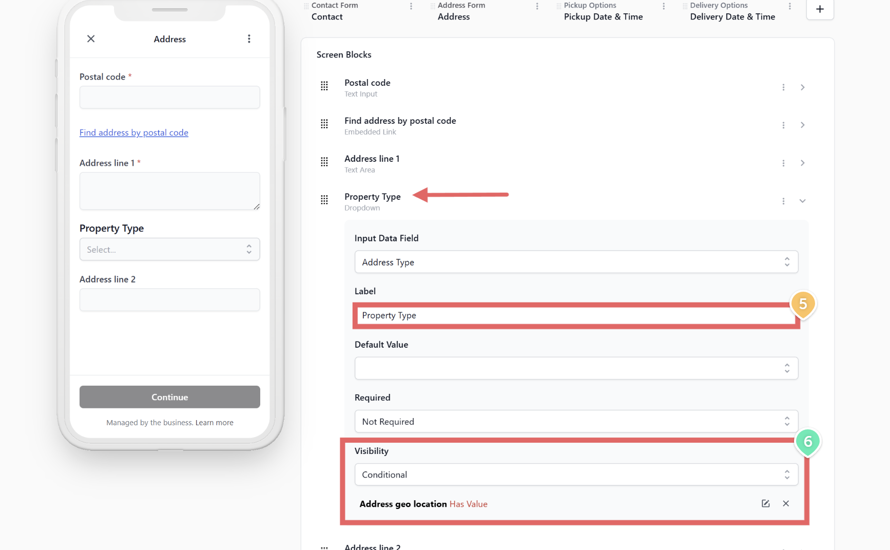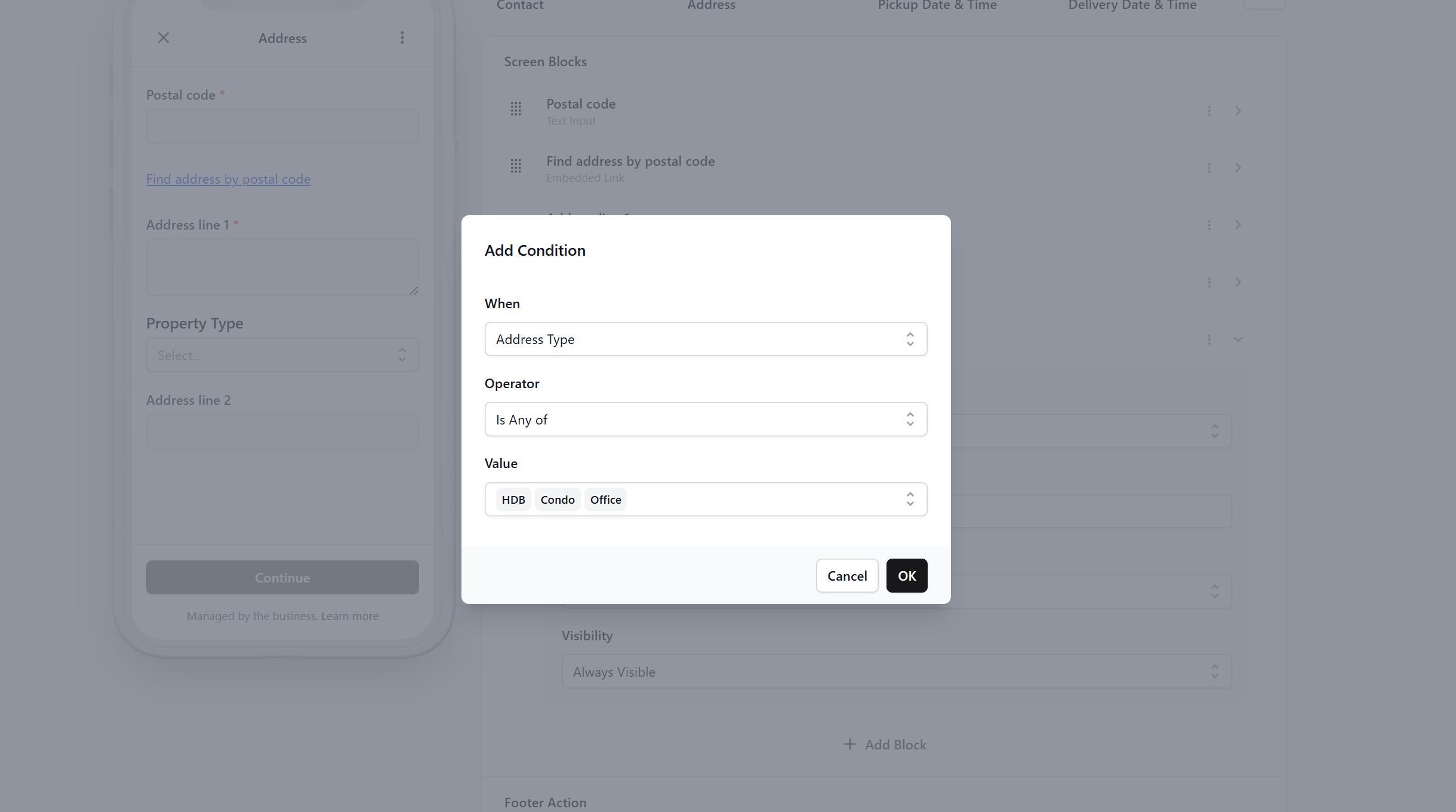 - Set Visibility to Conditional. Choose When: Address geo location -> Operator: Has Value. This ensures the dropdown only appears after the customer finds their postal code.