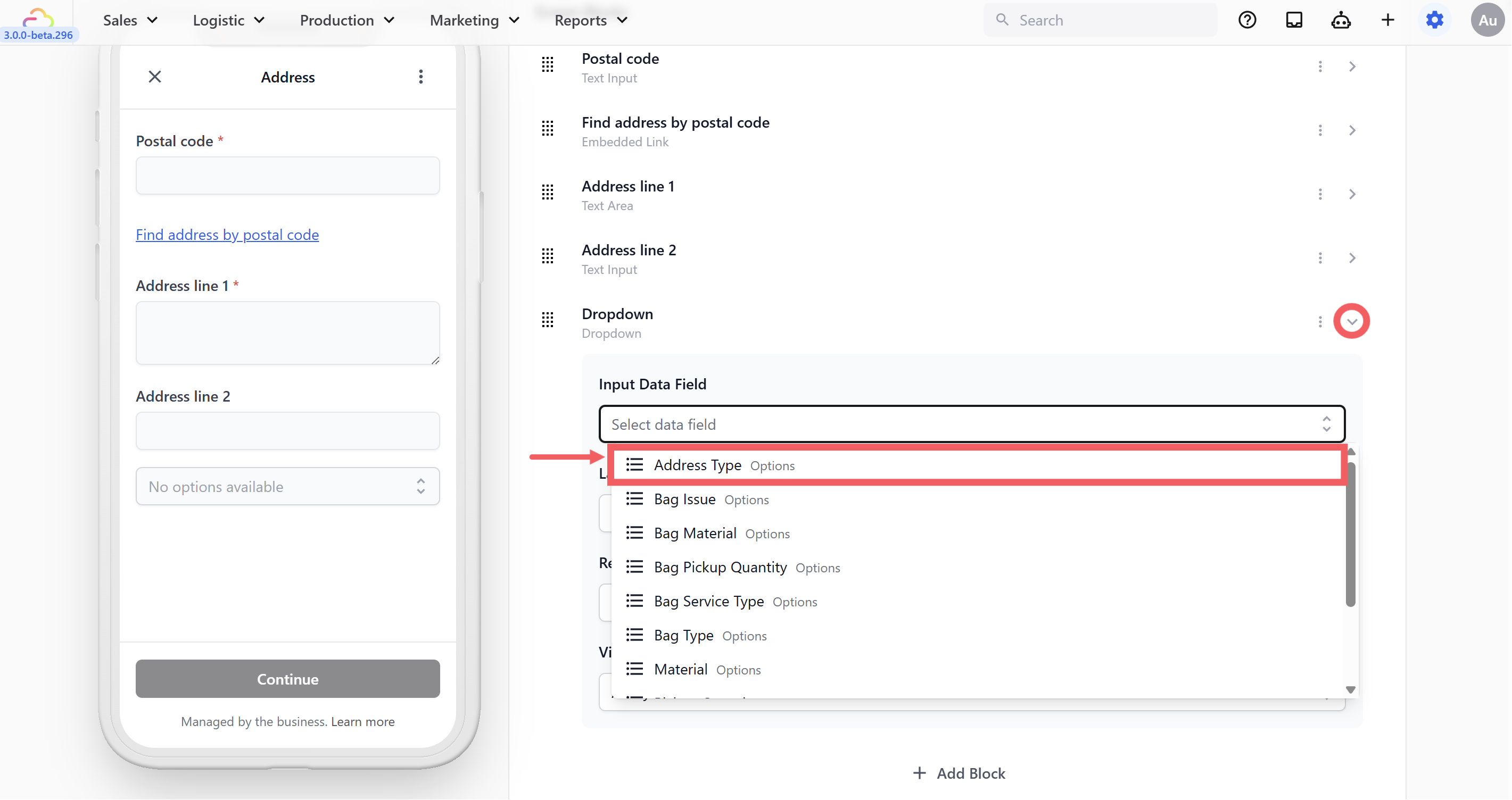 - Open the block settings (click the โ arrow). Set the Input Data Field to your newly created Address Type field.