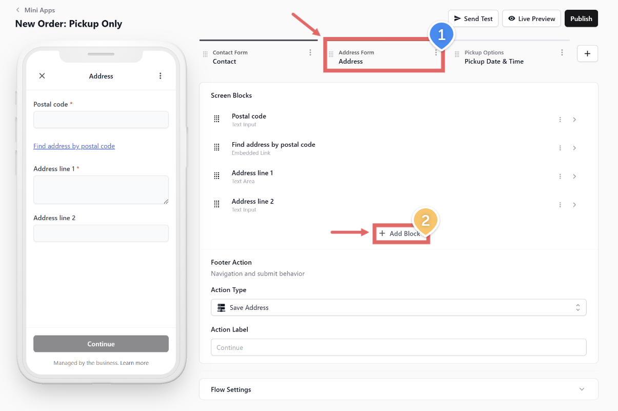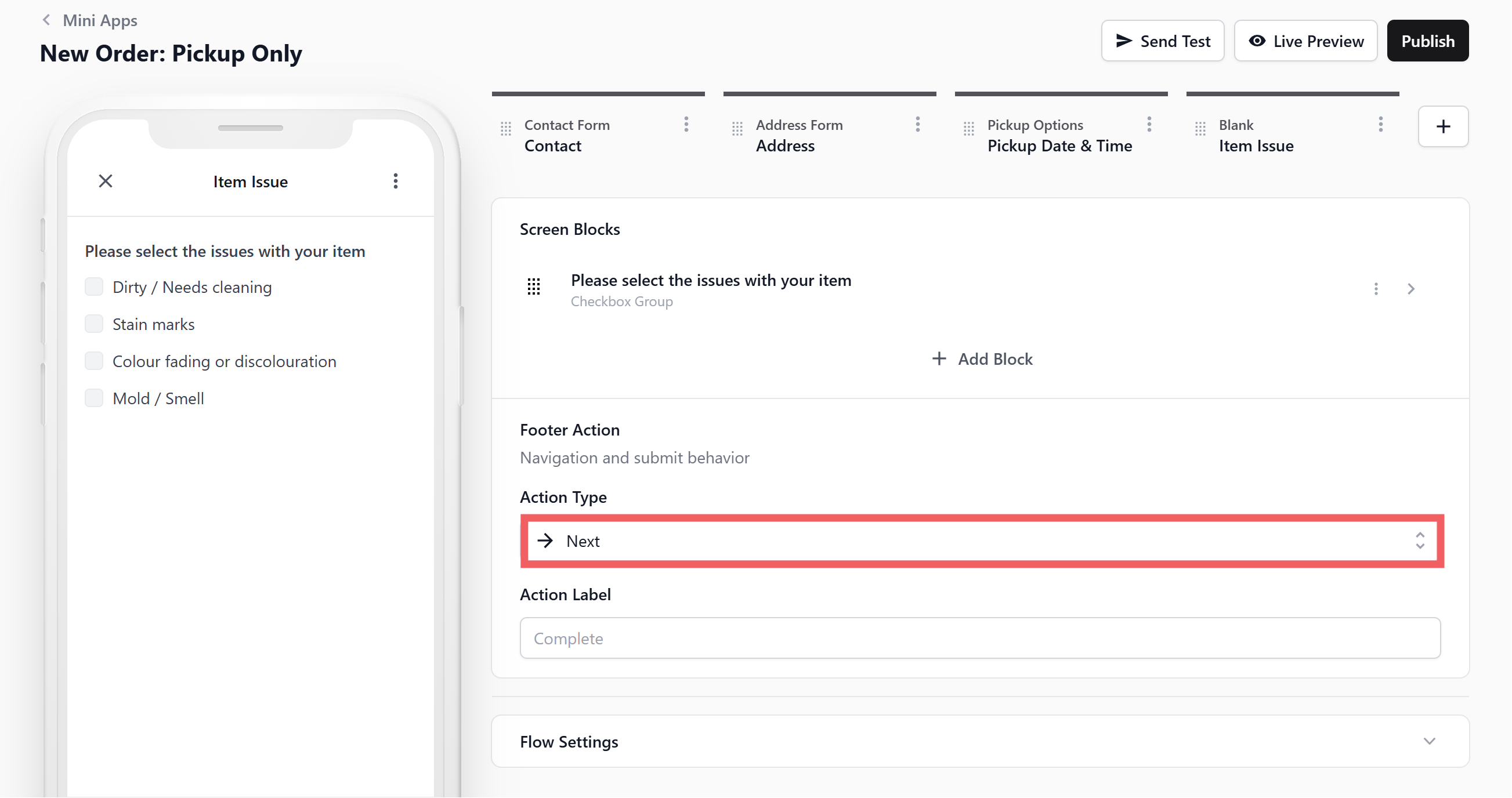At the very bottom of the editor for each screen, you will see a Footer Action. This controls what the button at the bottom of the customer's phone does when they tap it. It might tell the app to save the customer's details, move to the next page, or finally create the order.
