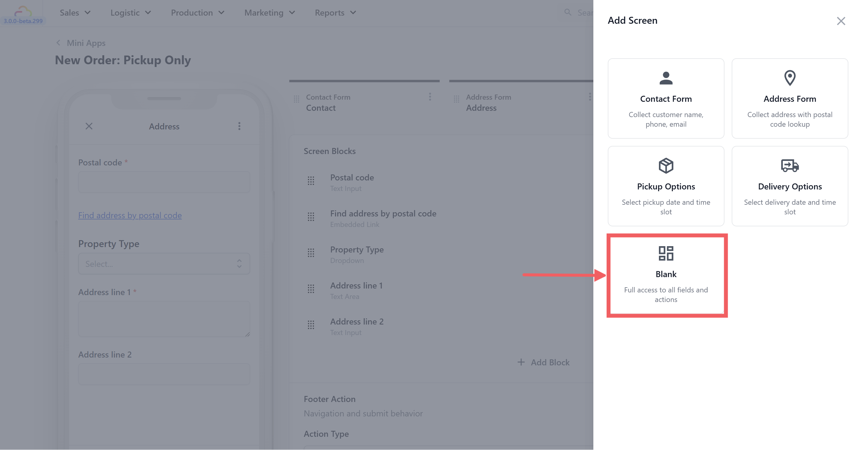 - Back in your Mini App editor, click the + button next to your screen tabs at the top right to Add Screen.