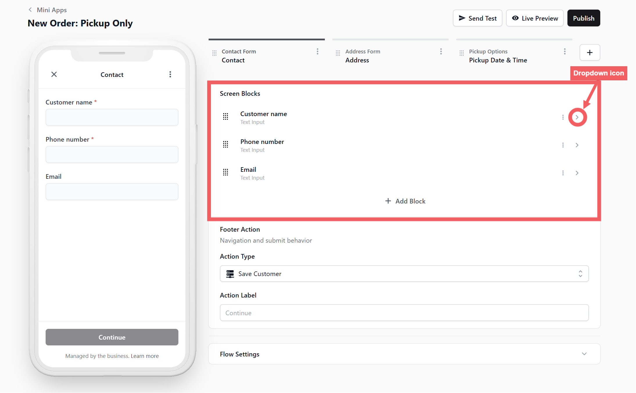 Inside every screen, you will see a list of Screen Blocks. Think of a block as a specific field or question you want the customer to fill out (like their name or their phone number). If you click the dropdown arrow icon ( ⌄ ) next to any block, it will expand to show its settings: