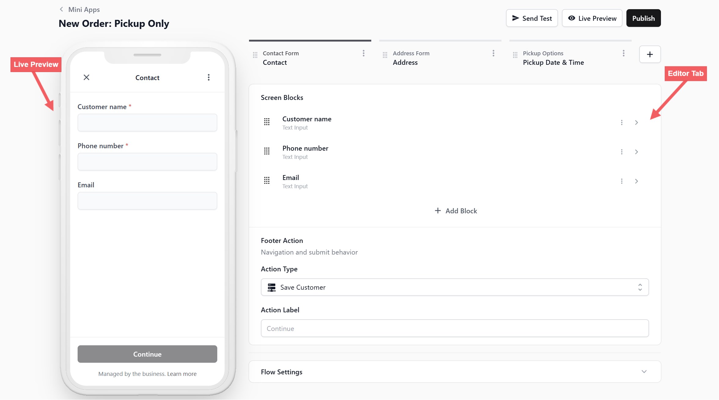 - You will now be taken to the Live Preview screen. This screen shows you exactly what your customer will see and interact with on their phone.