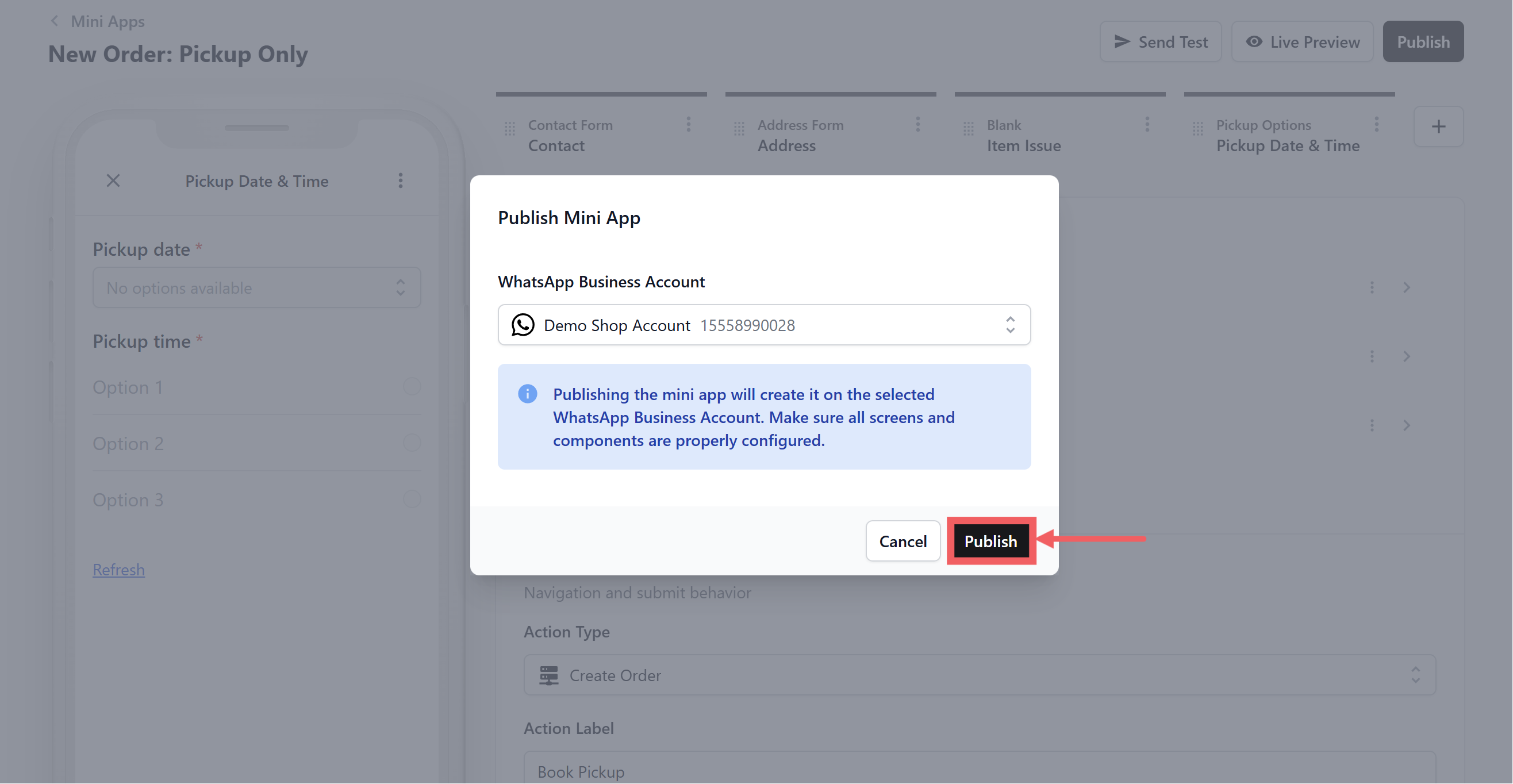 - A confirmation dialog box will pop up. Ensure your WhatsApp Business Account is selected correctly, then click Publish.