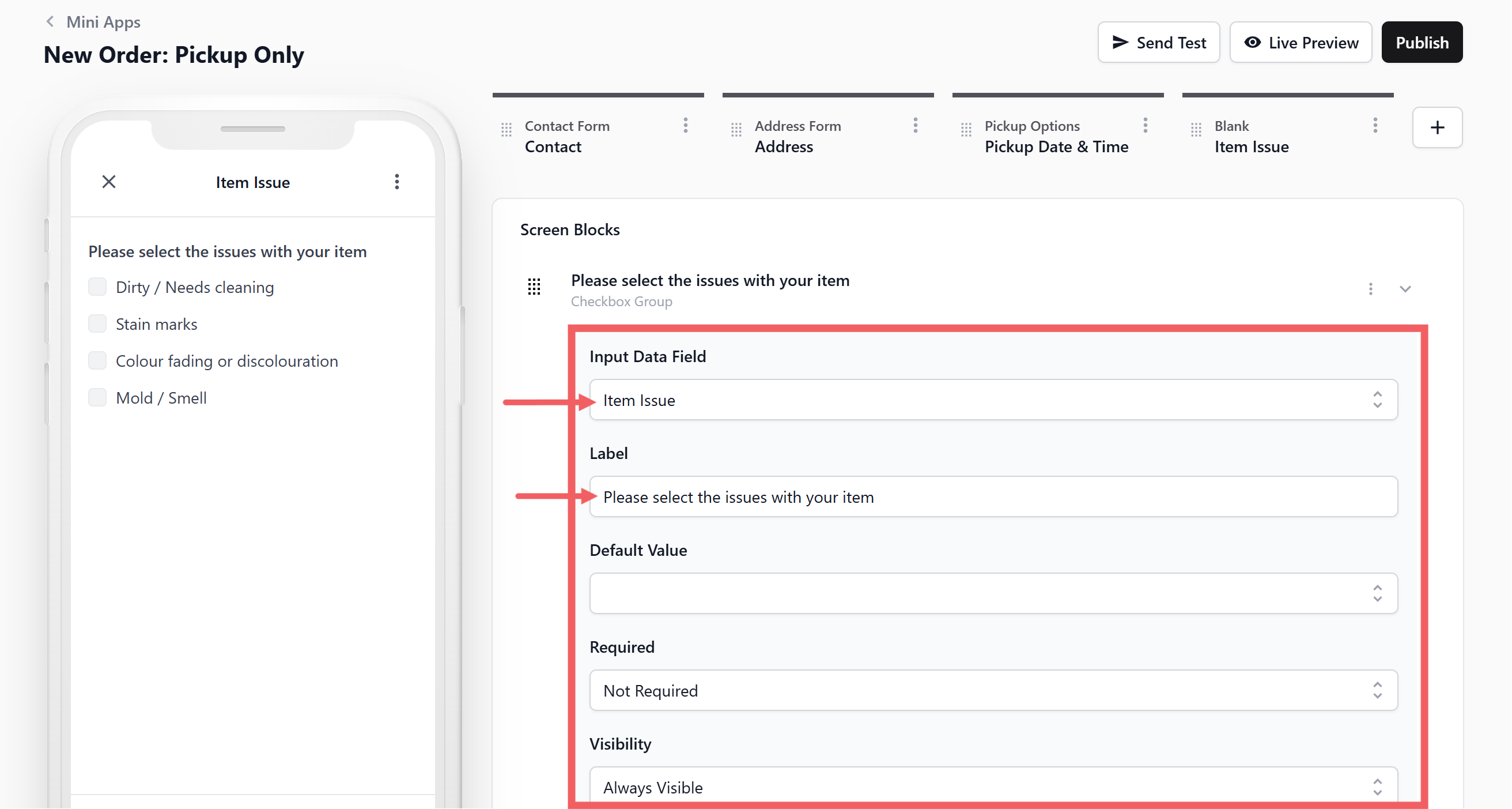 - Open the block settings. Set the Input Data Field to your Item Issue field, and change the Label to "Please select the issues with your item".