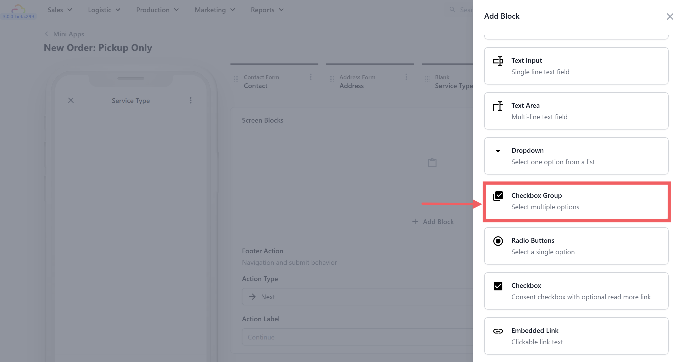- Inside your new screen, click + Add Block and select Checkbox Group. A Checkbox Group is a block type that displays a list of options with checkboxes — your customer can tick one or more choices at the same time. This is different from a Dropdown (which only allows one selection) or Radio Buttons (which also only allows one). Use it here because a single item might have multiple issues at once.