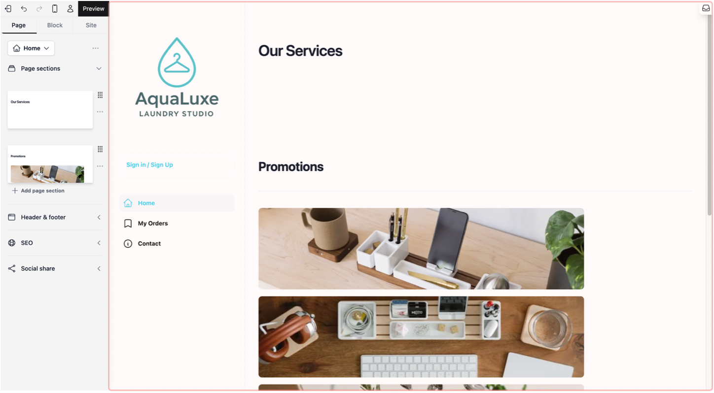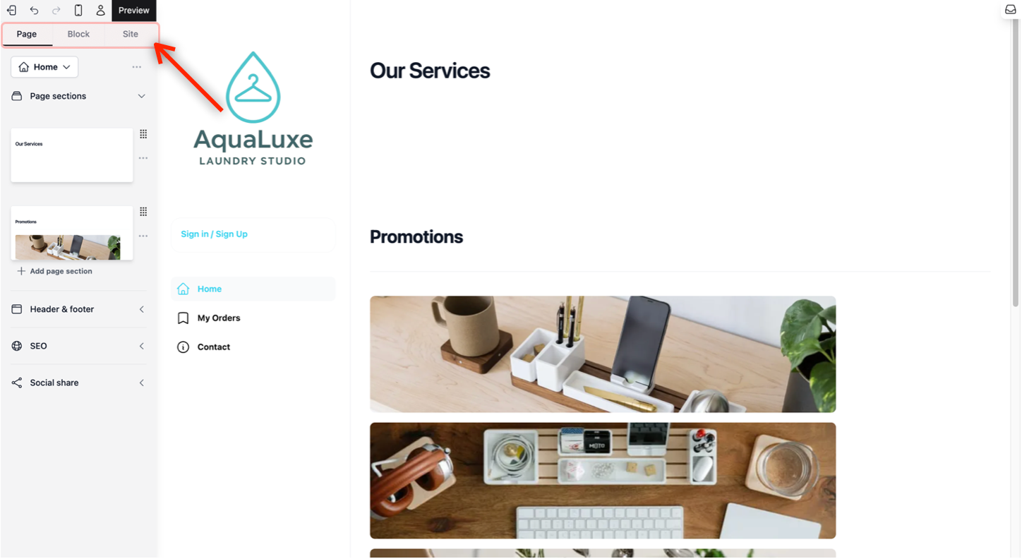 - 📄 Page Tab: This is where you manage the pages of your site. Just like organizing slides in a presentation, you use this tab to add new sections to the page, organise them to which order you want these sections to appear in, and decide what appears in your Website preview.
