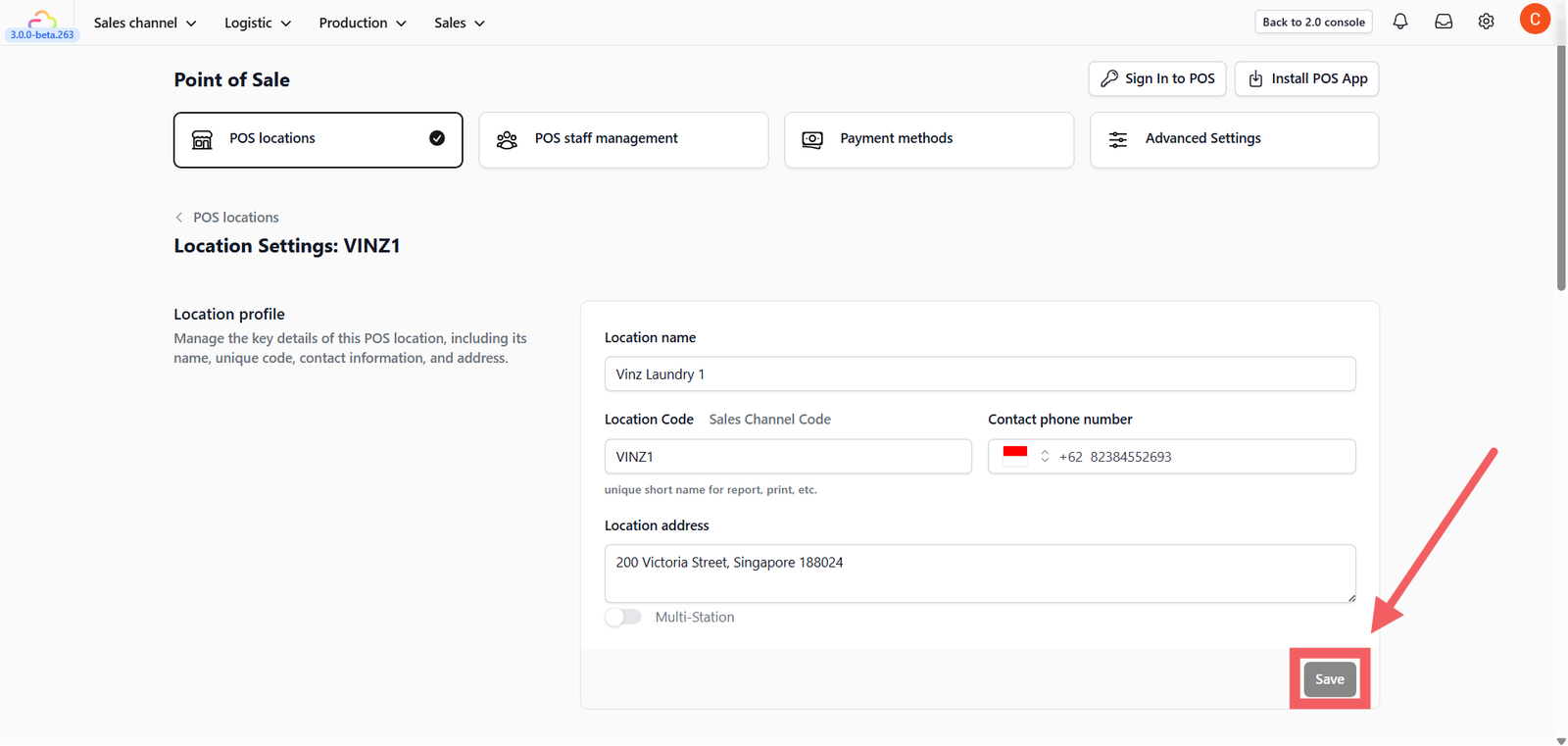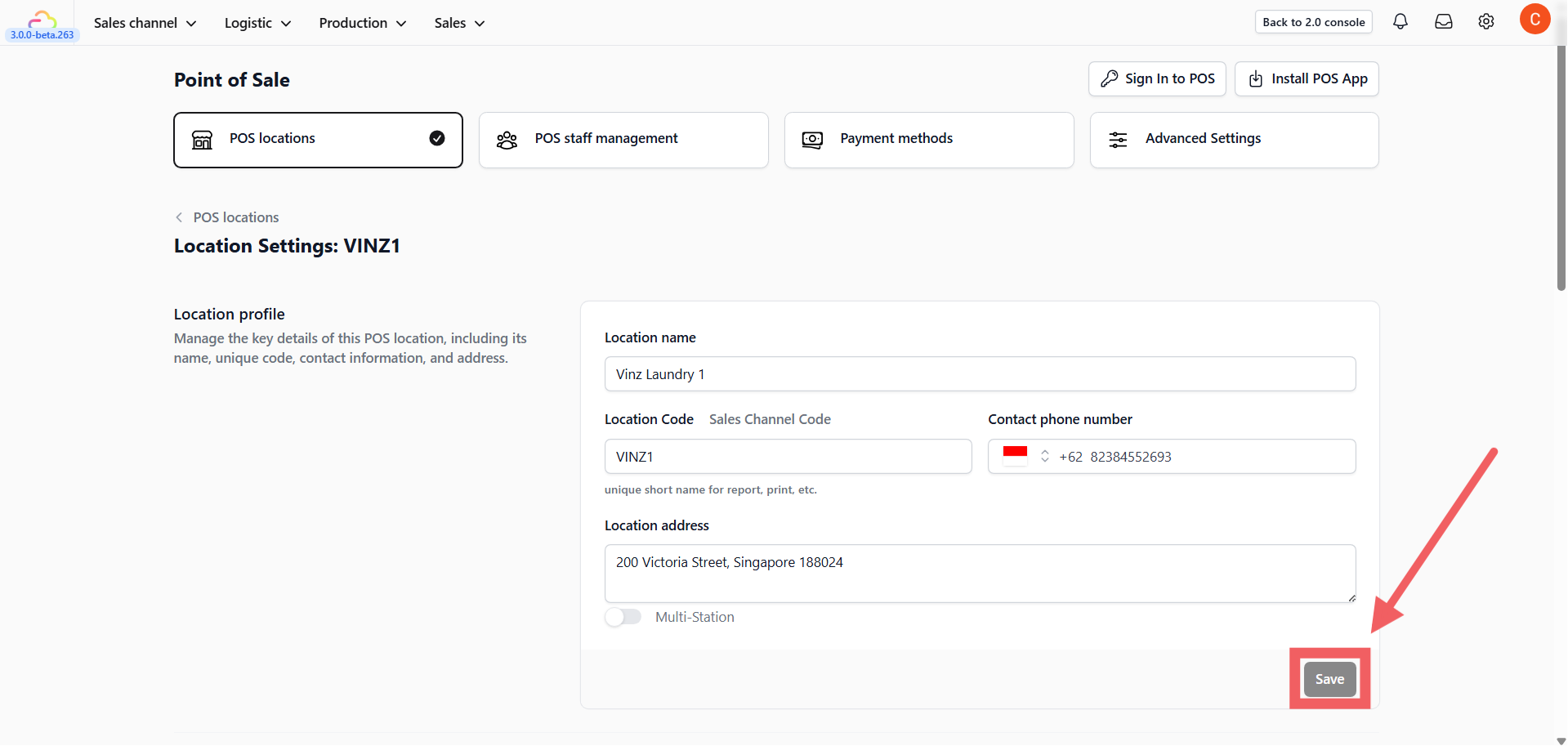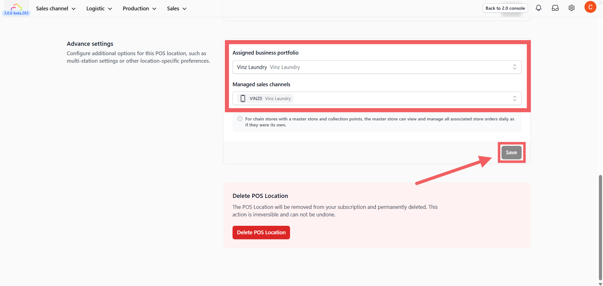 - Managed Sales Channels: Select which Sales Channel ID (e.g., "VINZ0") is linked to this location.