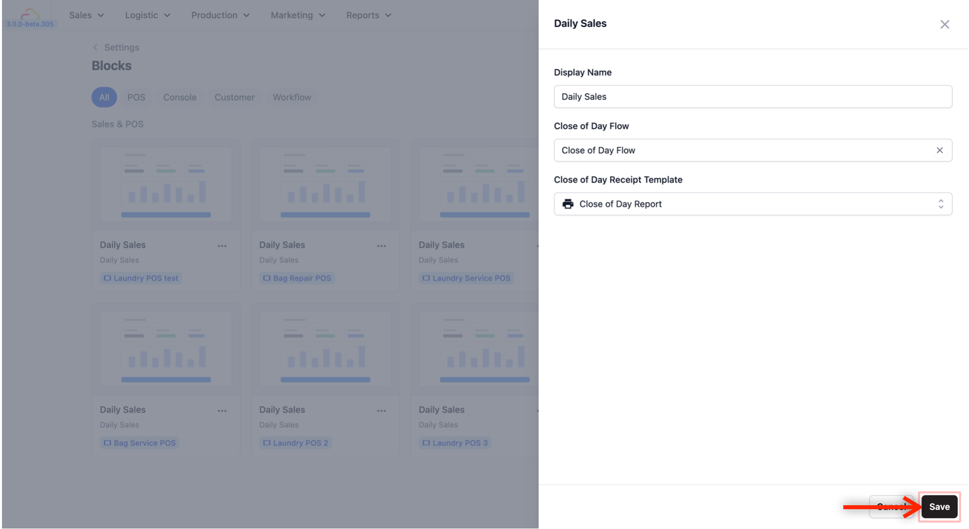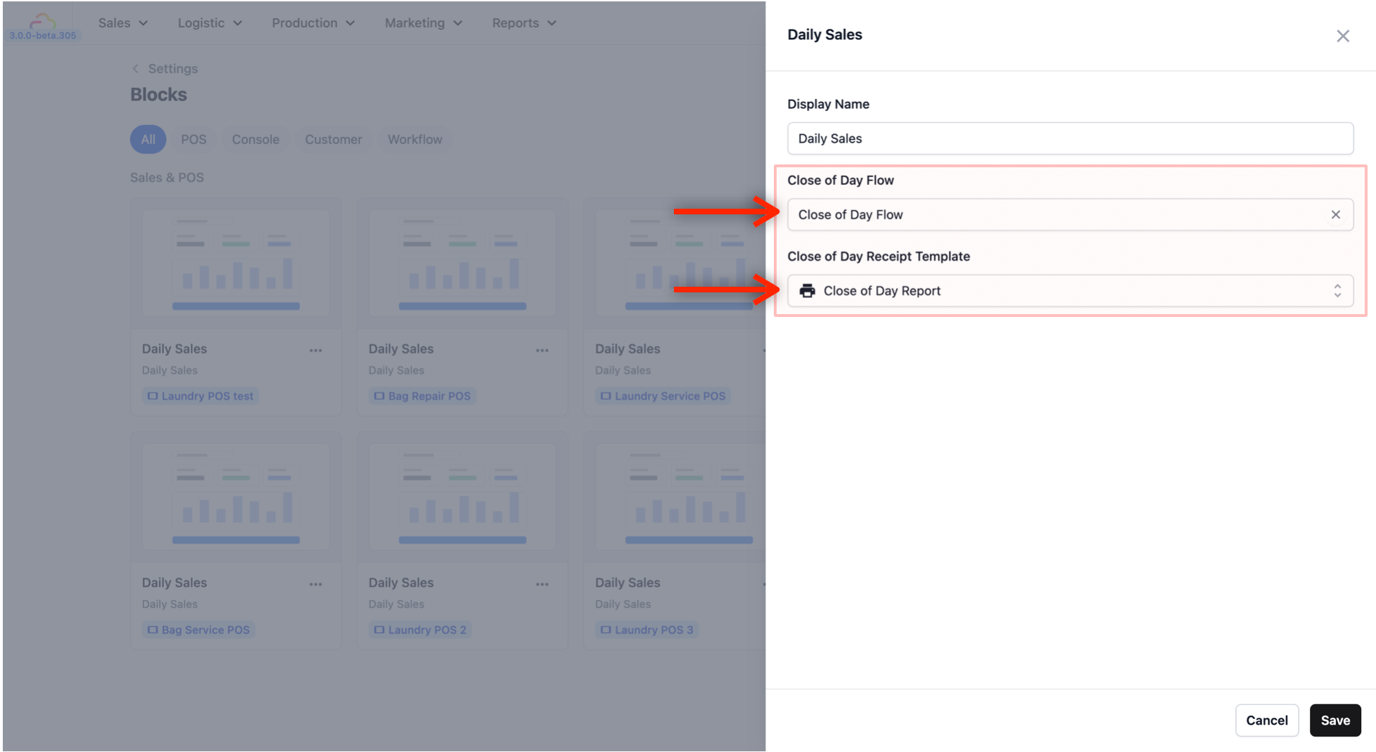 The Daily Sales block is what powers the Daily Sales screen in your POS — it is where your staff goes to see the day's sales summary and run the Close of Day report. Now you need to connect the flow and receipt template you just created to this block so everything works together.