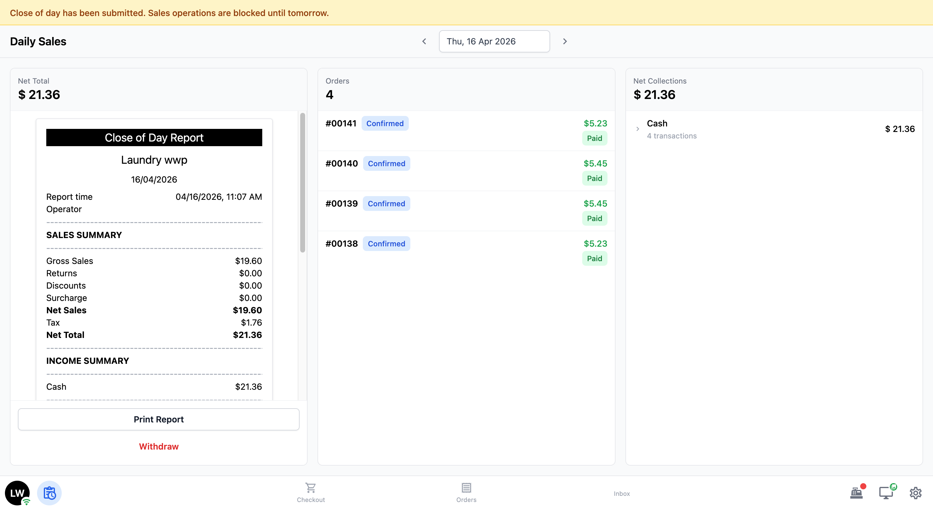The day's report, orders, and net collections will still be visible on the screen. Your staff can print the report by tapping Print Report if they need a physical copy.