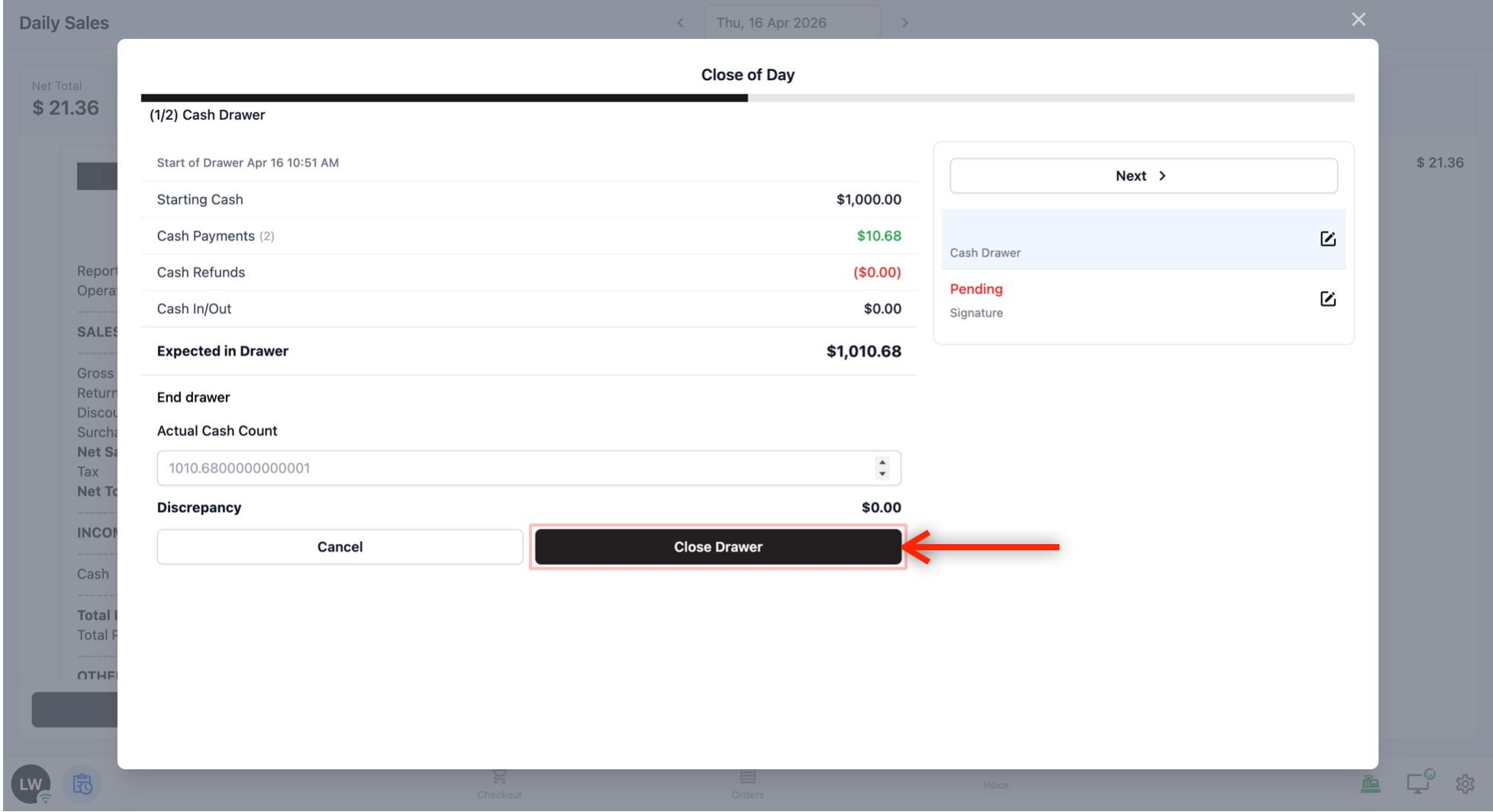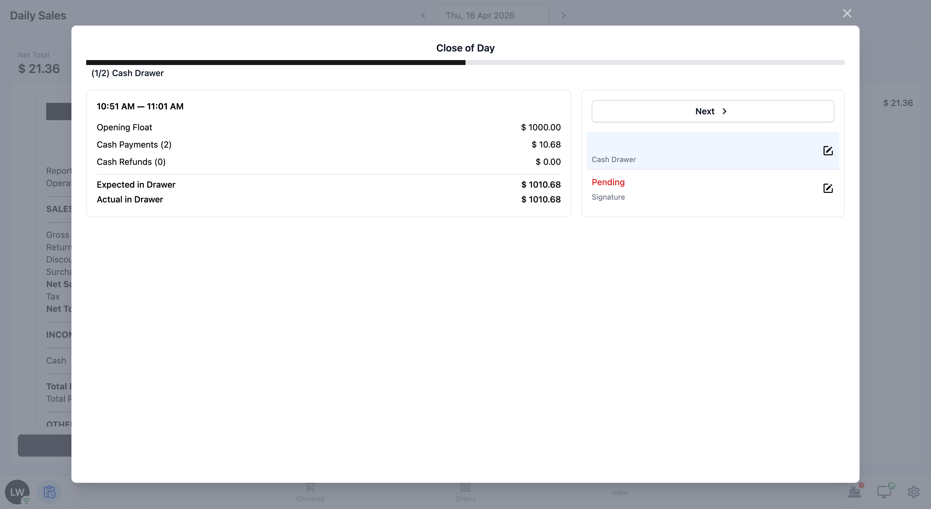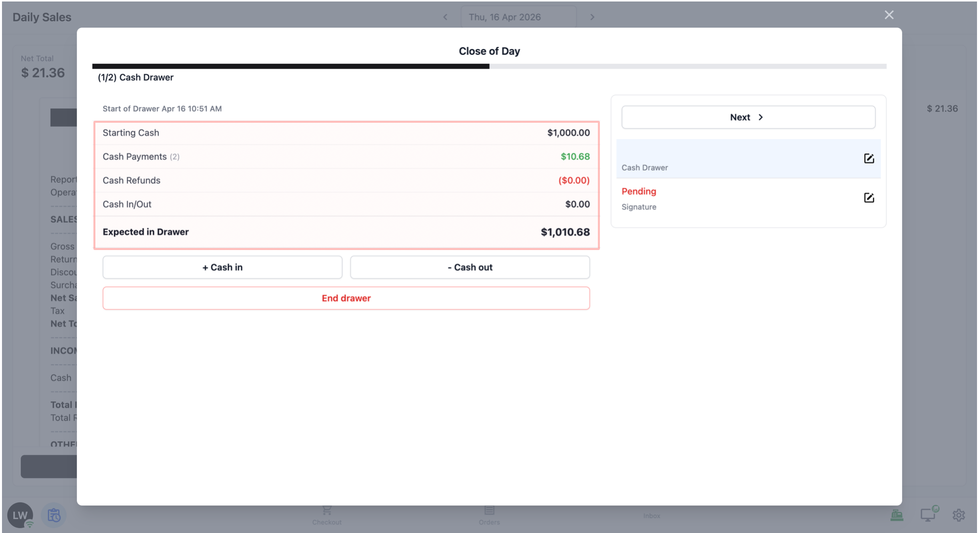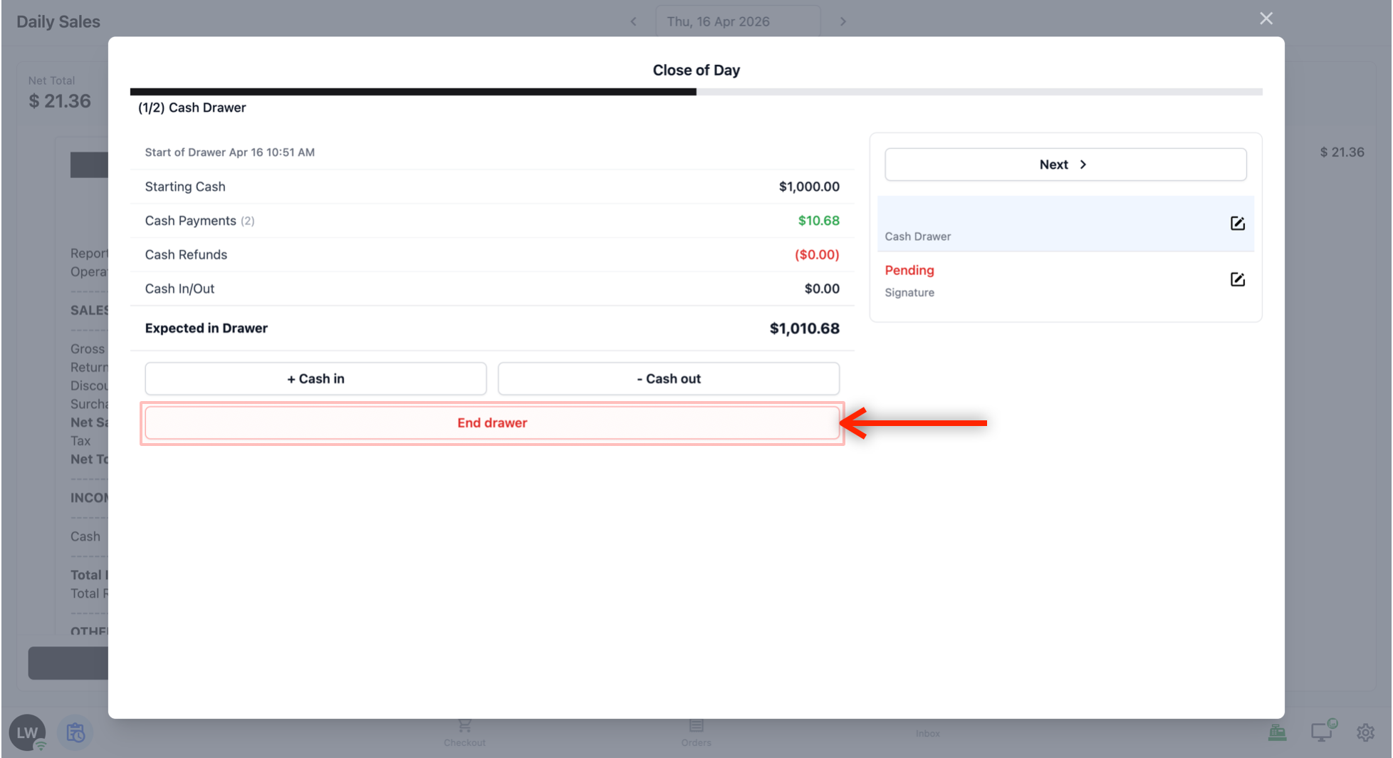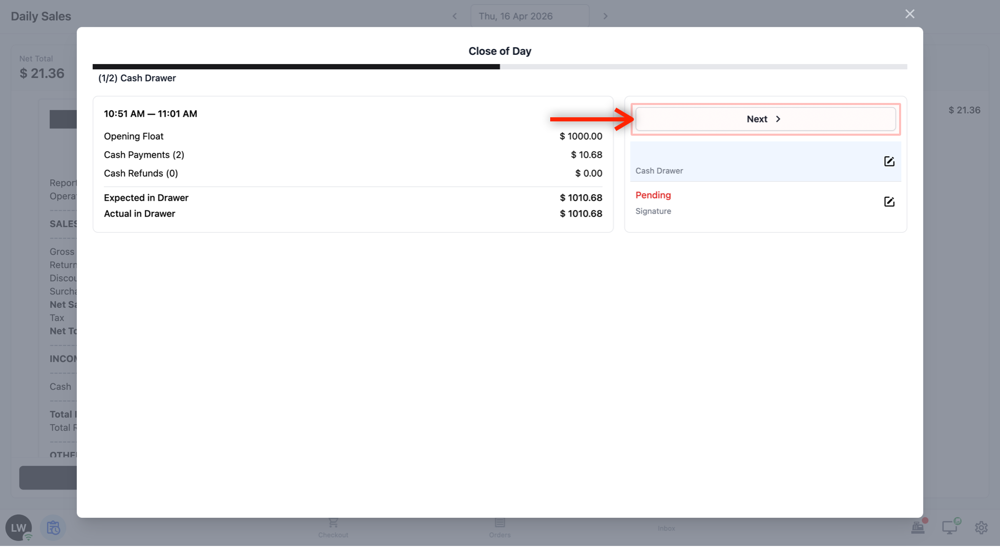 When your staff is done reviewing the cash drawer summary, tap Next to move to the signature step.
