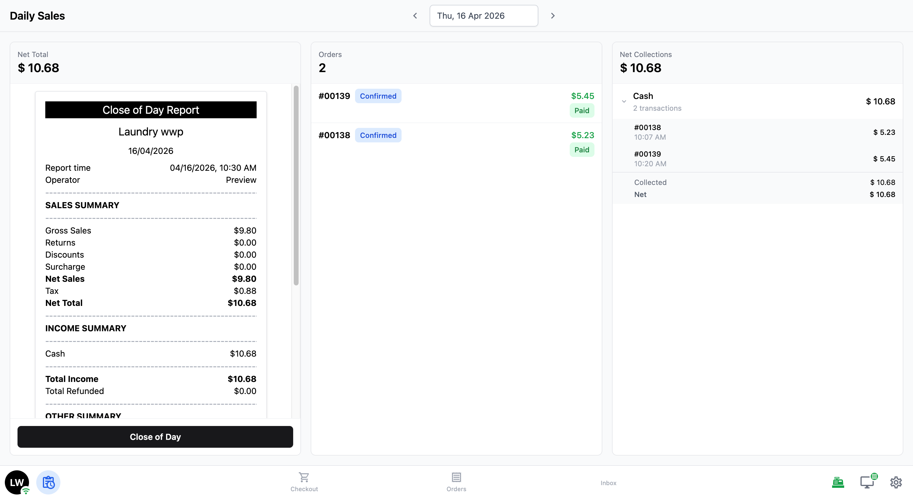 At the end of each business day, you will want to close out your sales and see a summary of how much money came in. The Close of Day report gives you a full breakdown — total orders, total sales, income by payment method (cash, VISA, NETS, bank transfer), and any outstanding balances.