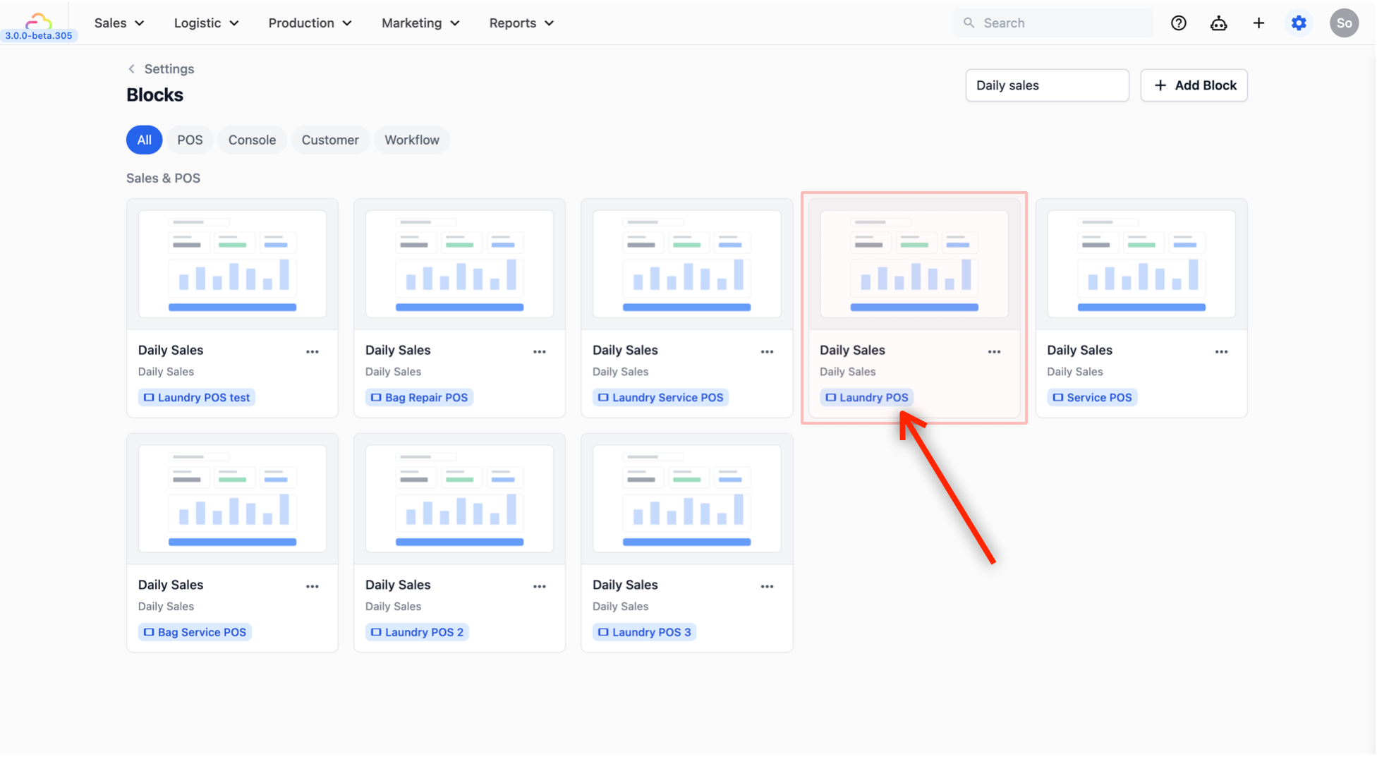 - From Settings (gear icon), click on the Blocks page and find the block called Daily Sales. Check that the name of the POS app you created earlier appears as a blue tag underneath the block — this means it is linked to your POS. Click on the block to open its settings.