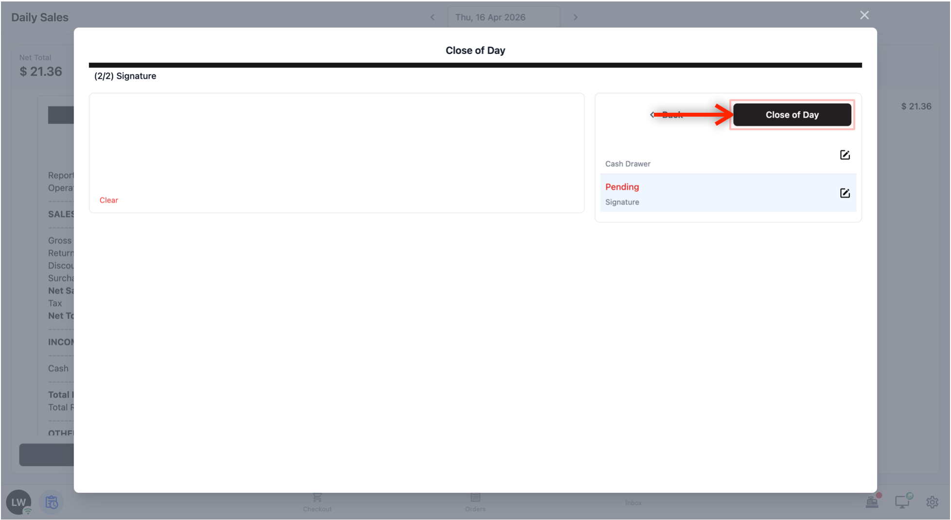 A signature pad will appear. Your staff signs off to confirm that the day's numbers are correct.