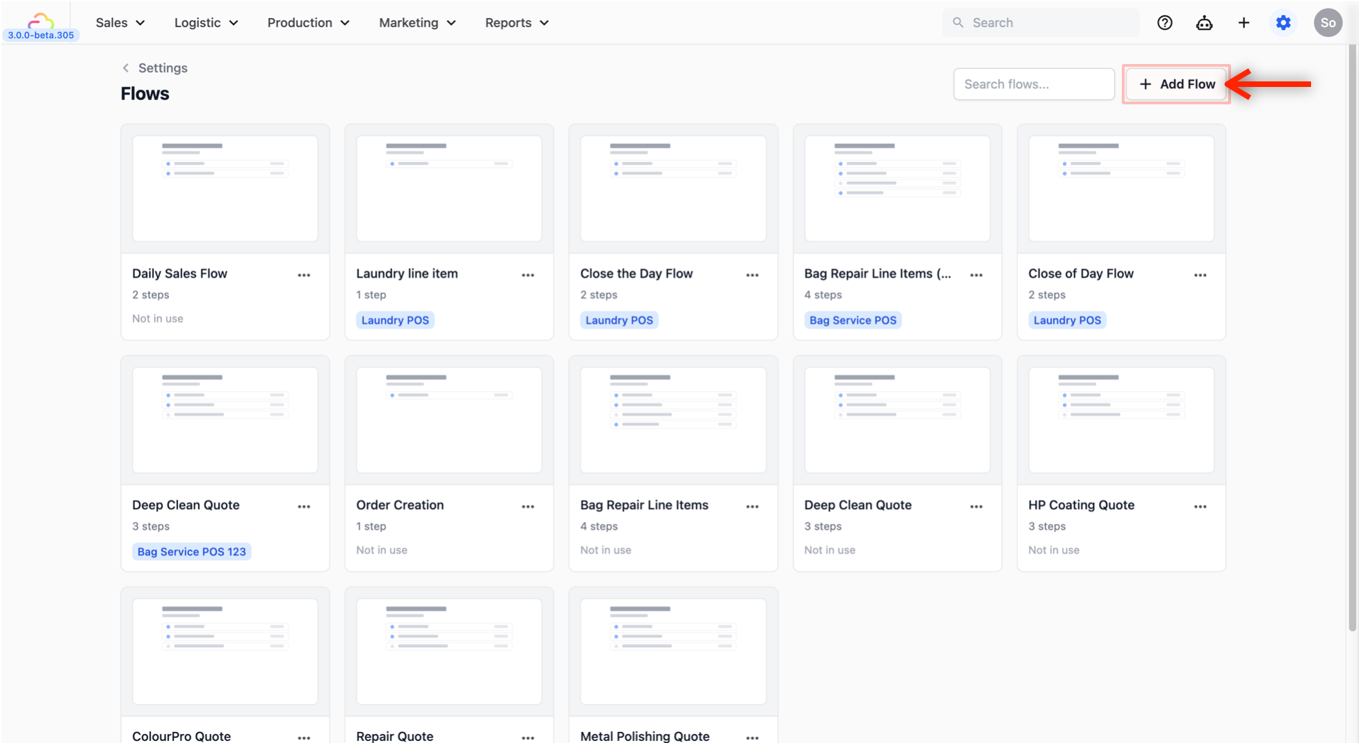 - From the Flows page, click on + Add Flow to add a new flow.