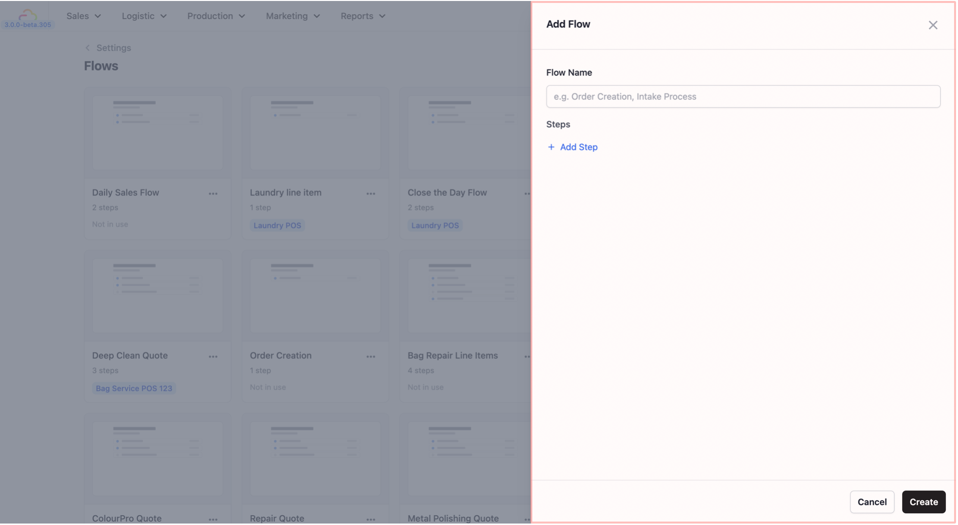 - A panel will open on the right side with two fields: Flow Name and Steps.