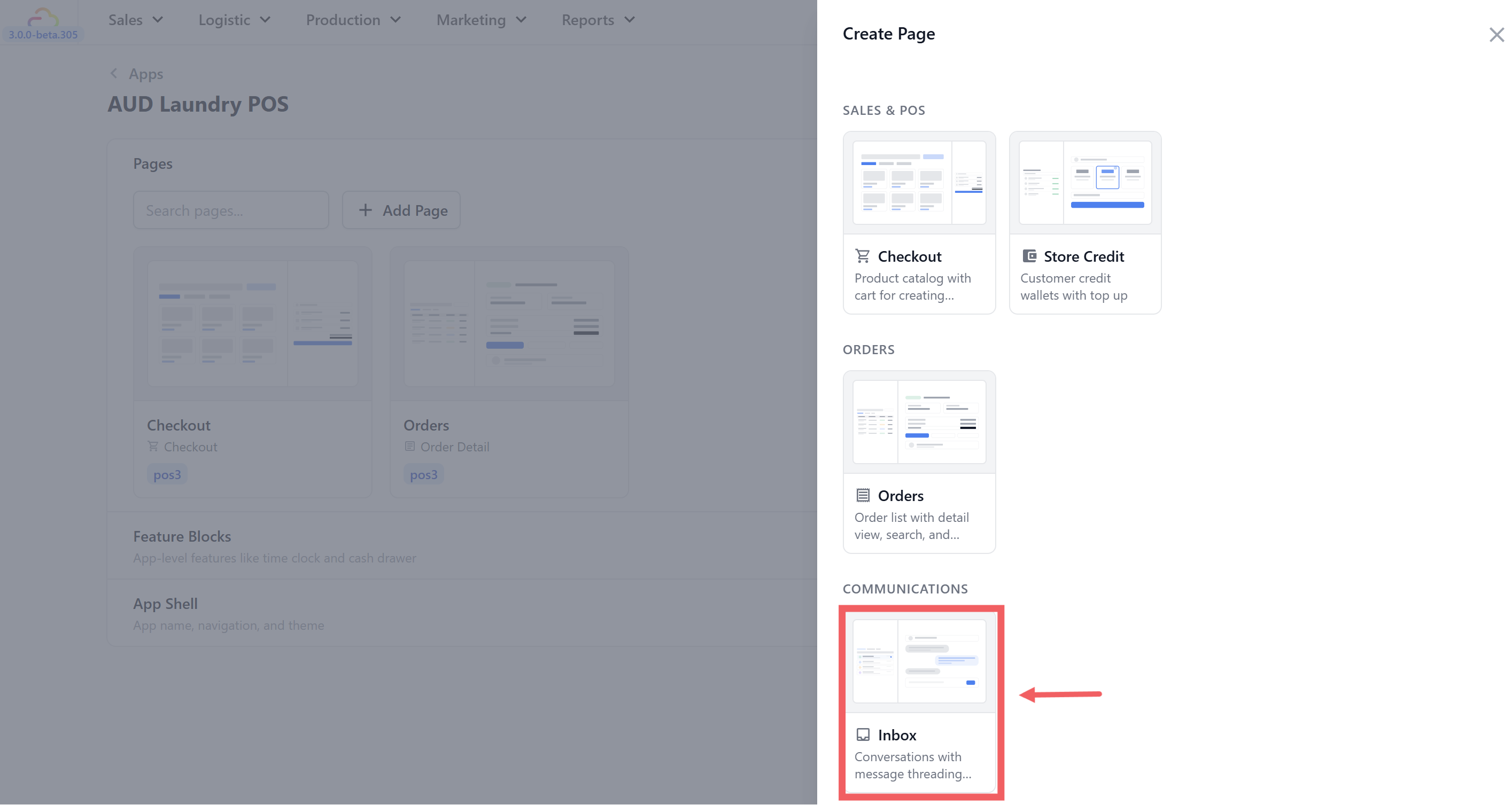 - A dialog appears showing page templates grouped by category. Under Communications, select the Inbox card.