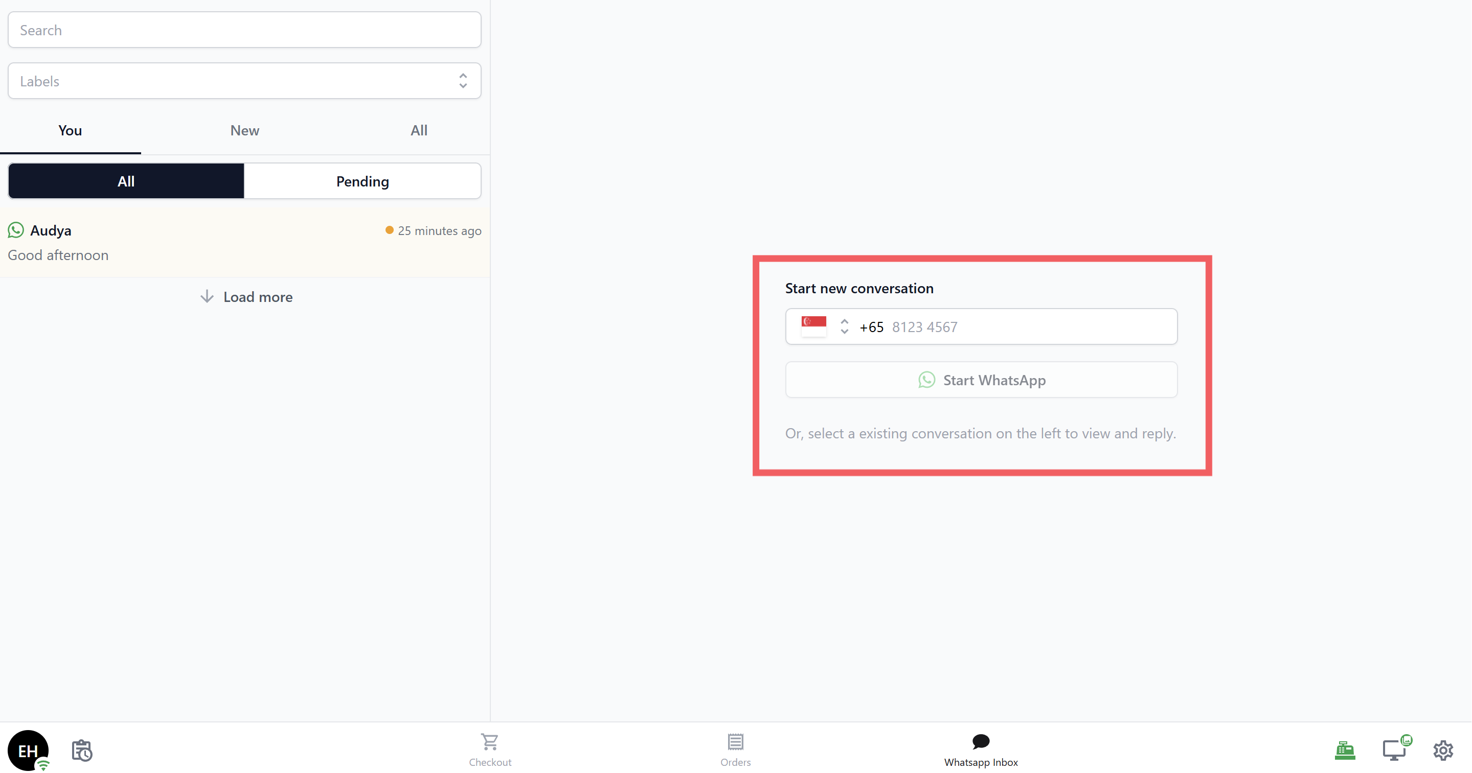 - If WhatsApp is not connected, the Inbox will still display any existing conversations, but staff won't be able to start new ones (the WhatsApp button won't appear).