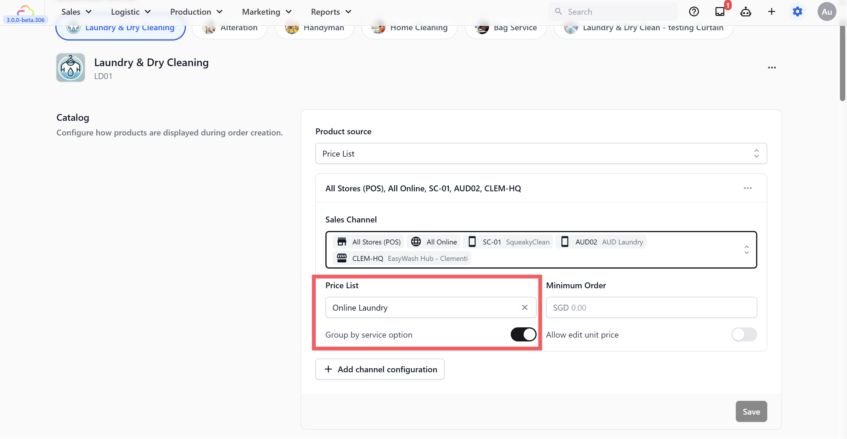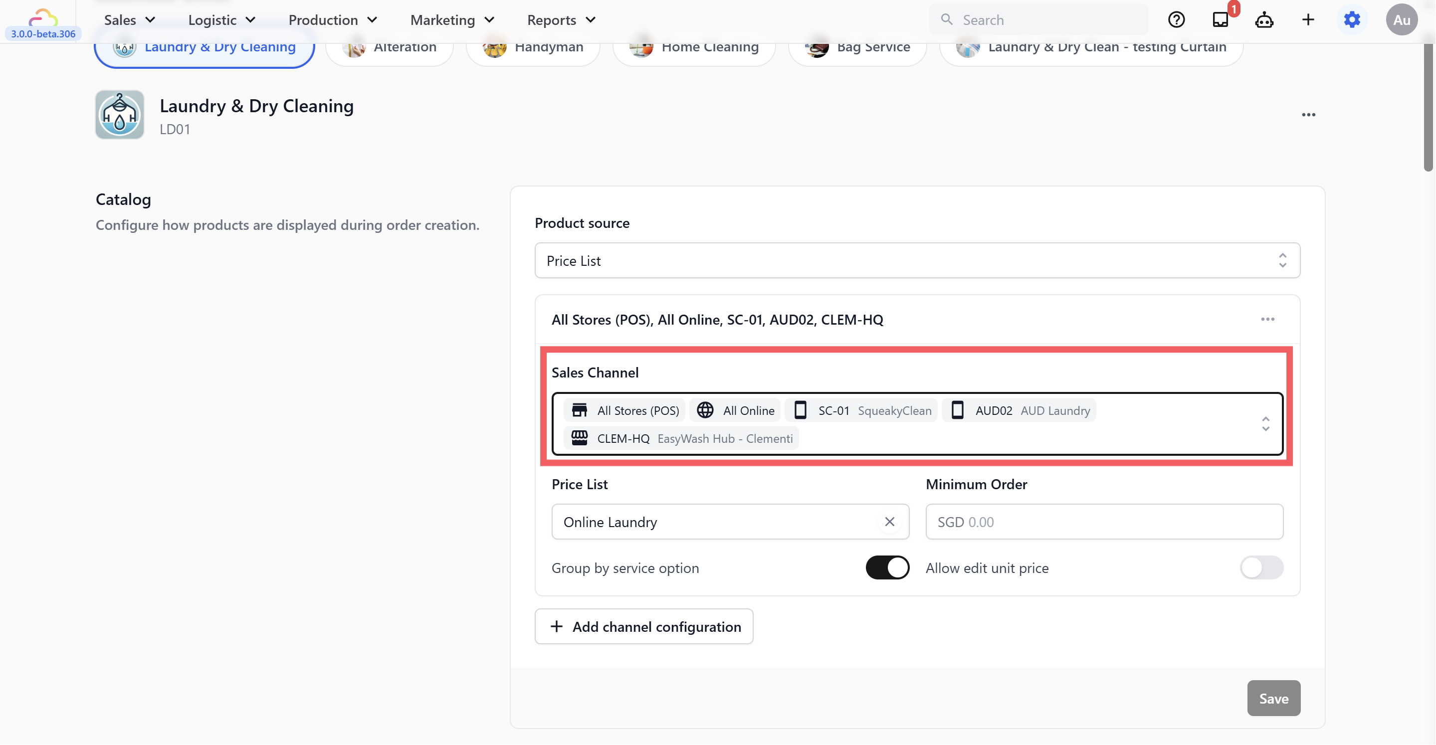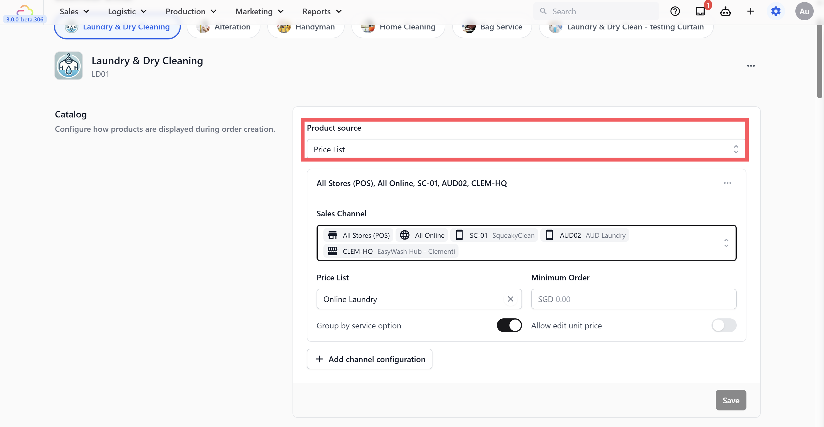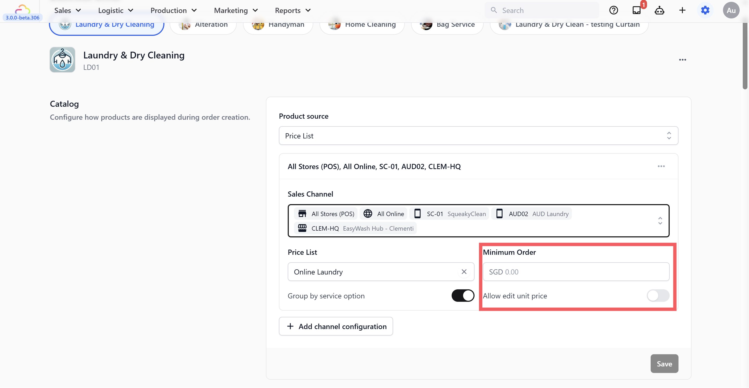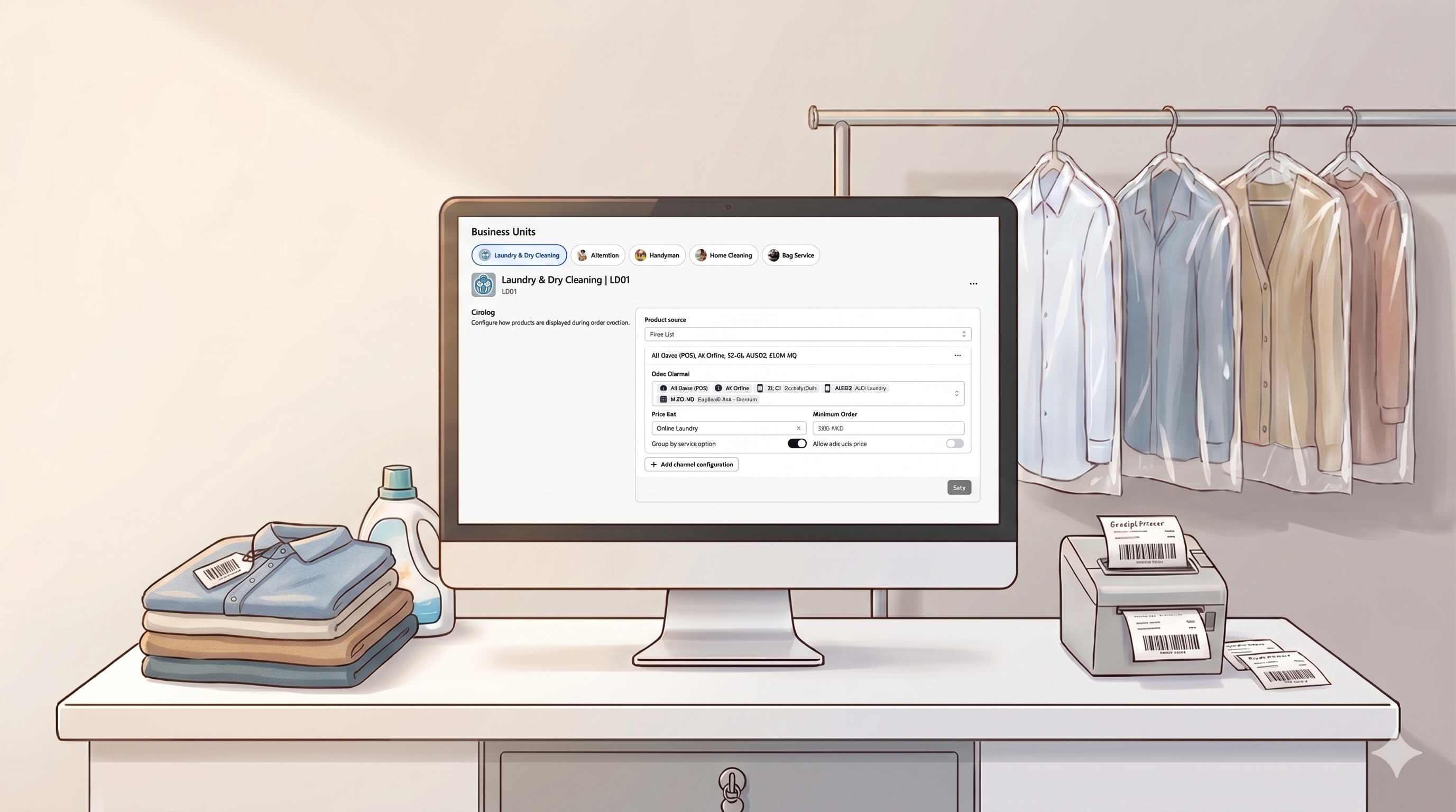 You can set up two separate Business Units β€” one for Laundry, one for Bag Service β€” each with its own catalog and settings. When staff create an order, they choose the business unit at the start.