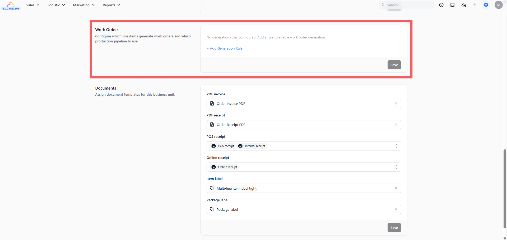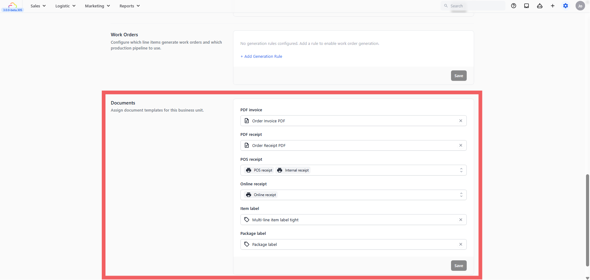 The Documents section is where you link your Business Unit to its print and digital templates. Without this, orders can still be created, but no receipts or labels will be generated.