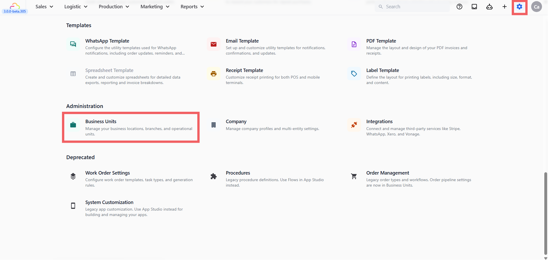 2. Scroll down to the Administration section and click Business Units