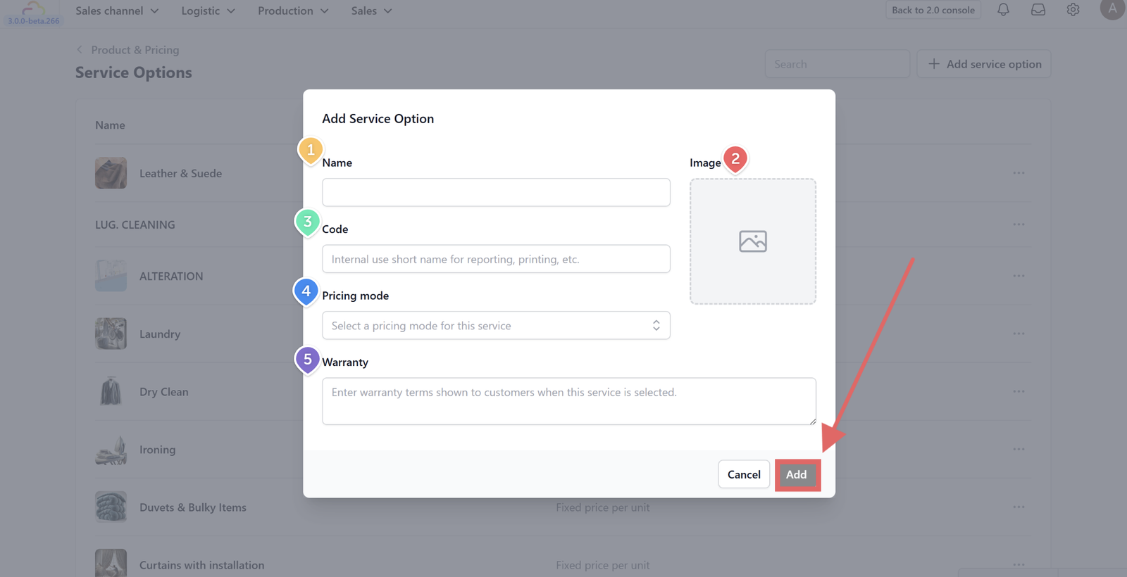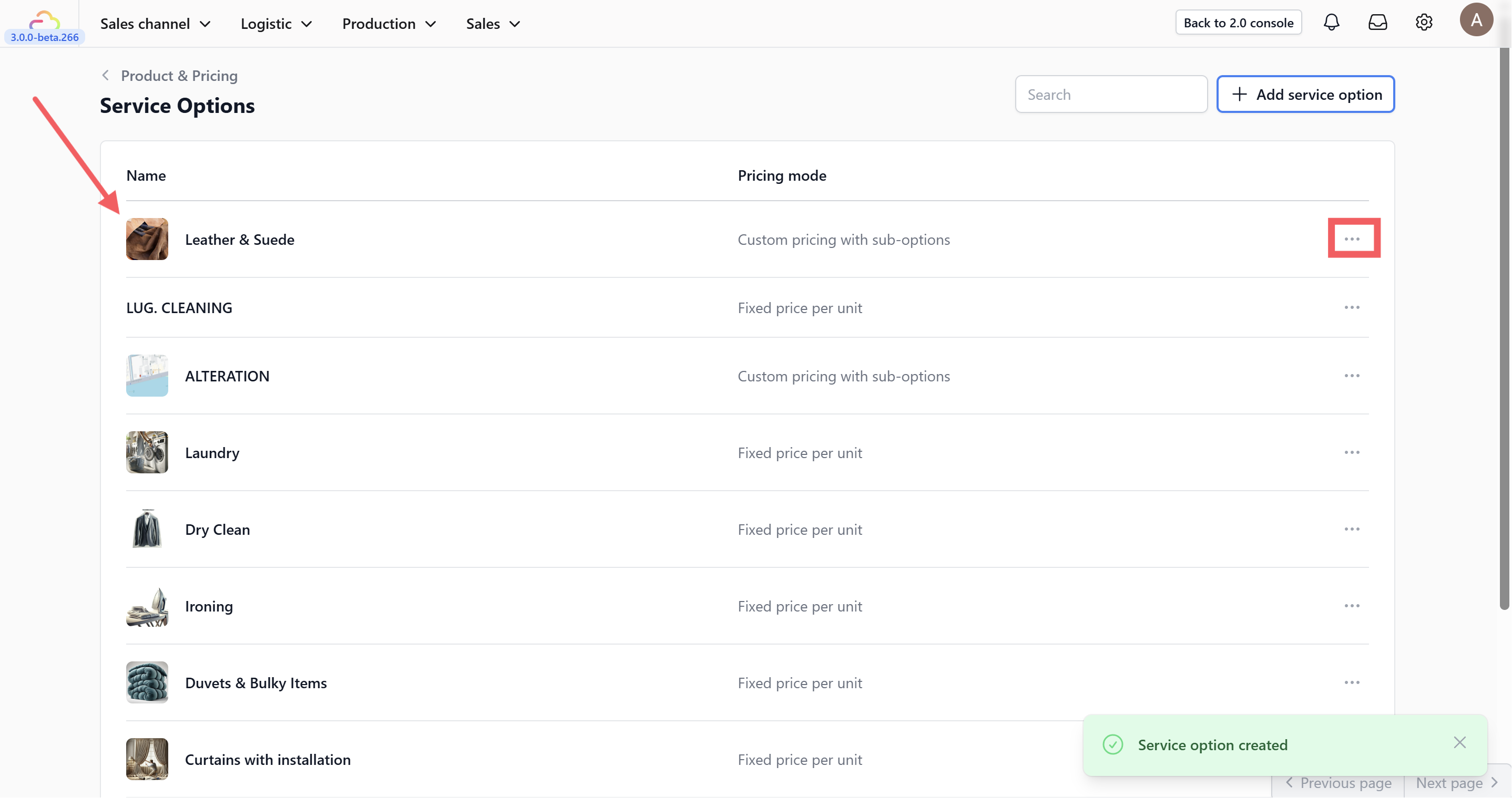 - Custom pricing with sub-options: Define specific sub-types (e.g., Jacket, Gloves) for the service, allowing you to enter different manual prices for each variation.