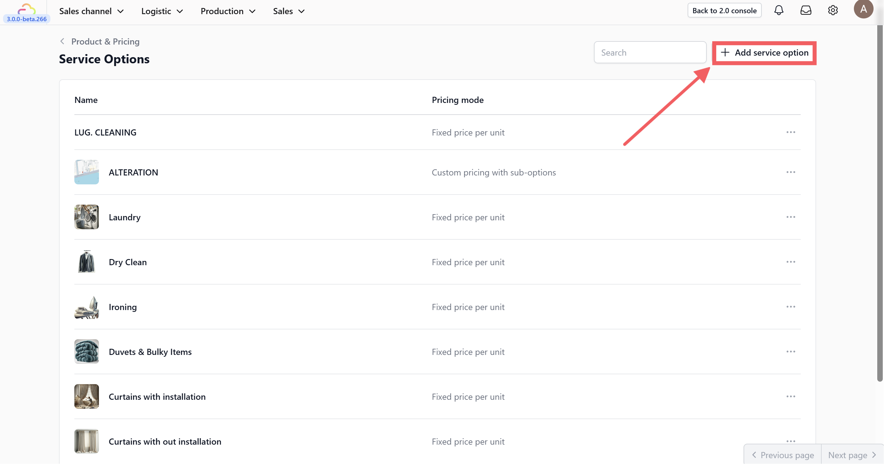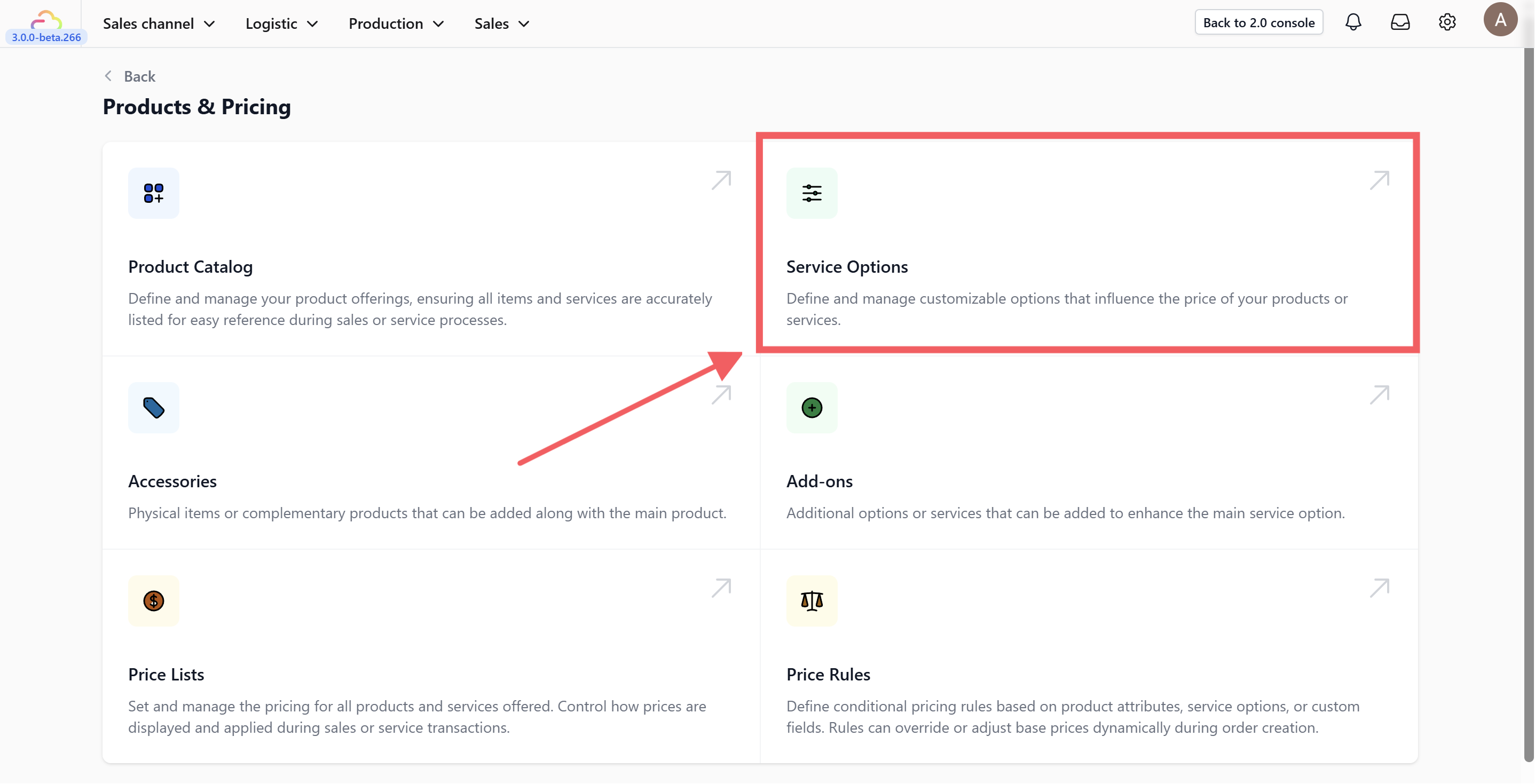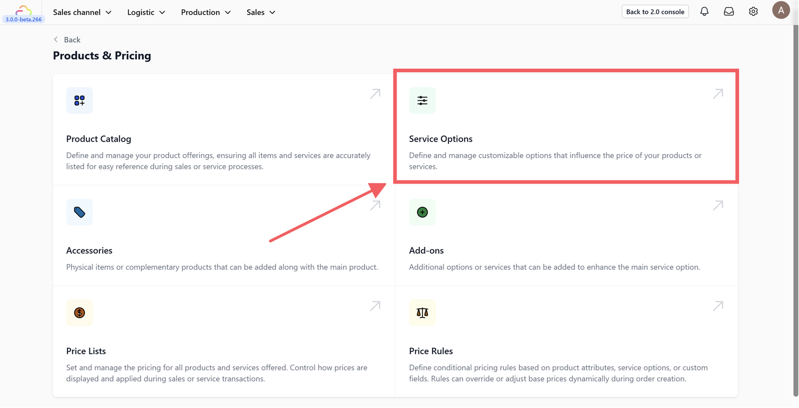 The Service Options page allows you to define and manage customizable options that influence the price of your products or services.