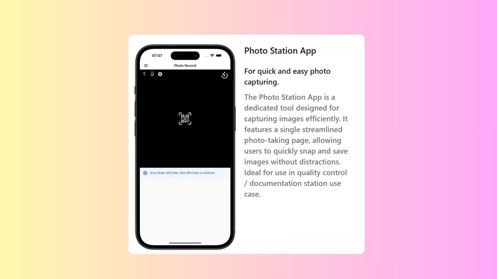 - Allows documentation through photo taking to track item conditions during processing.