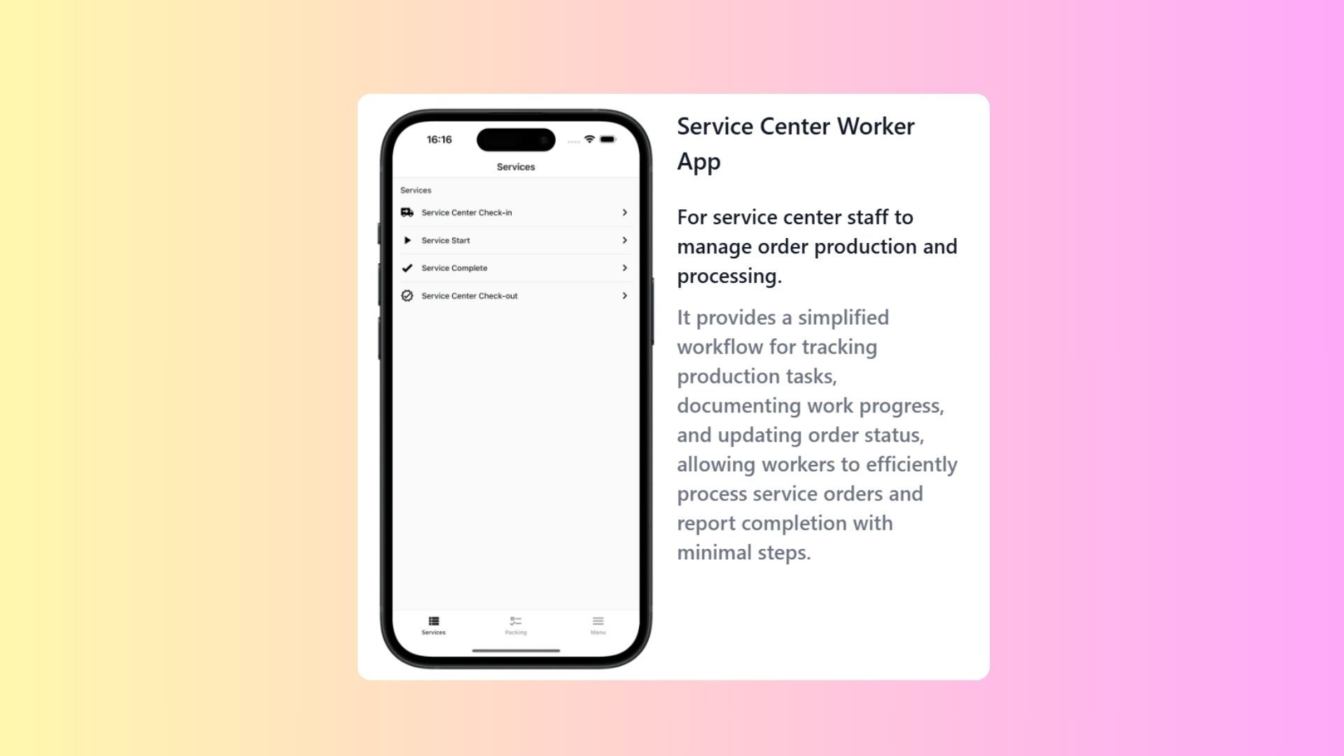 - Allows workers to update order statuses (e.g., Service Start, Service Complete) and report completion with minimal steps to ensure operational efficiency.