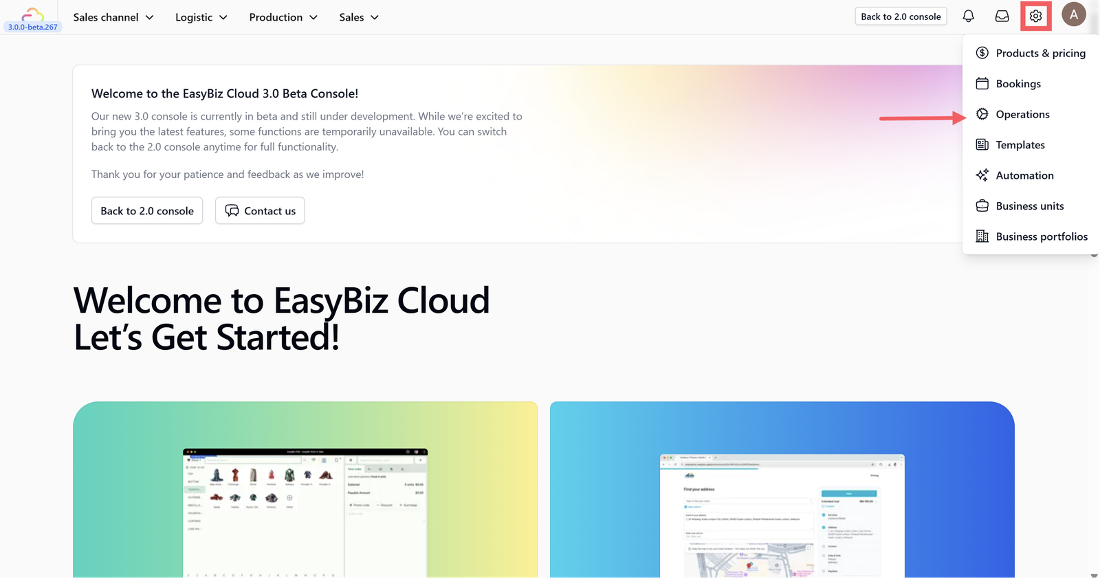 Click on the Settings icon in your dashboard and Choose Operations from the settings menu.