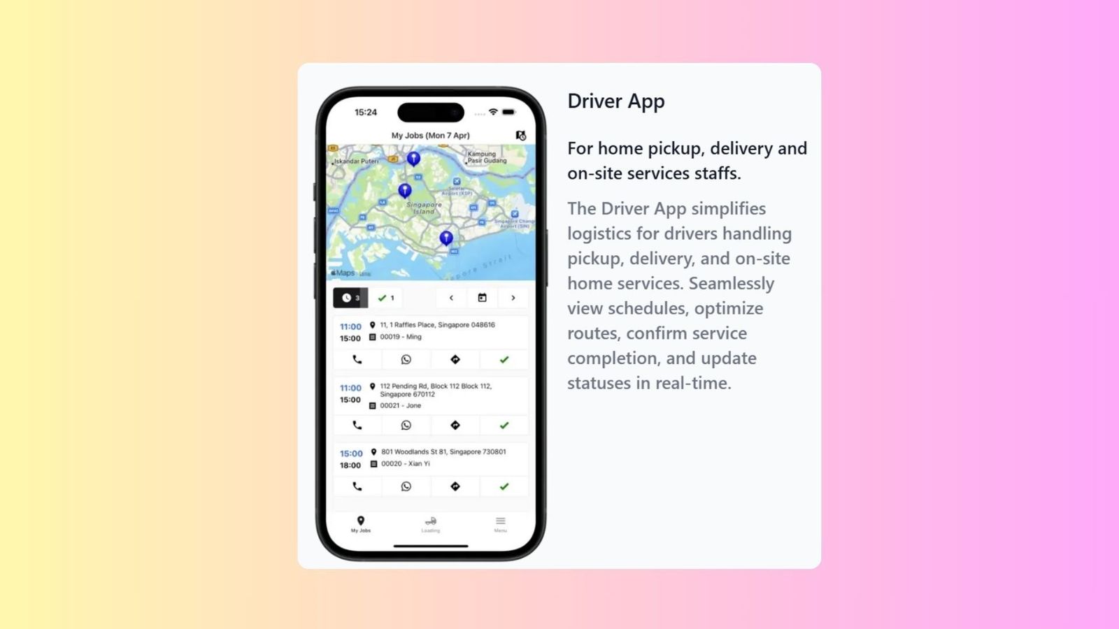 - Simplifies logistics by allowing drivers to view schedules and optimize their routes on a map interface.