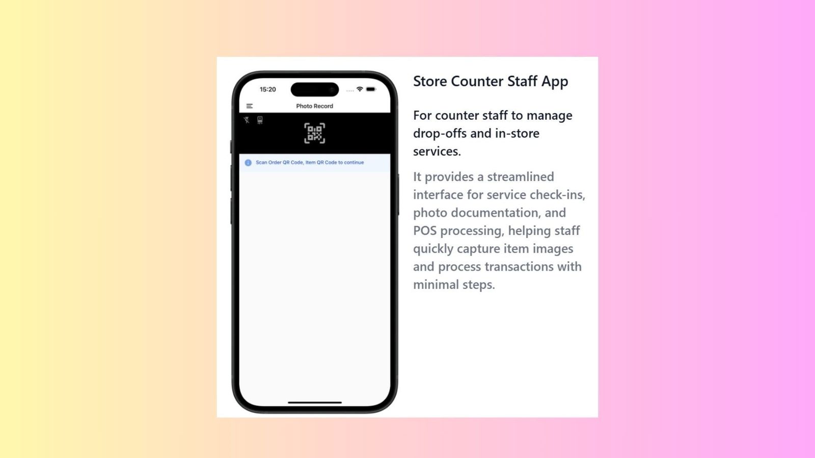- Assists staff in quickly capturing item images and processing transactions with minimal operational steps.