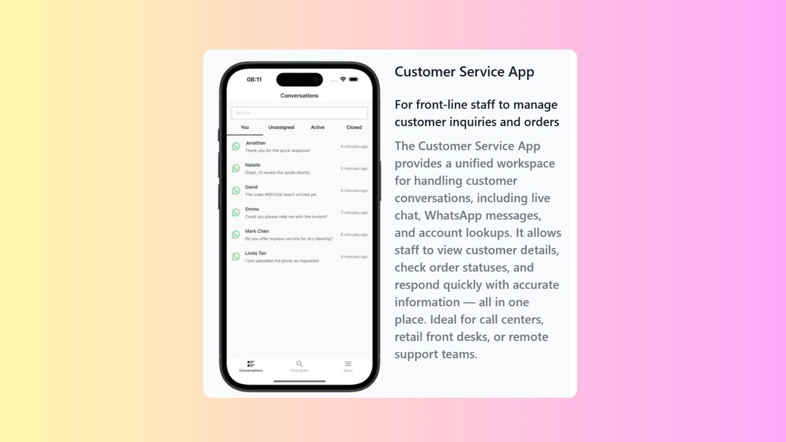 - Centralizes customer conversations, including live chat and WhatsApp messages.