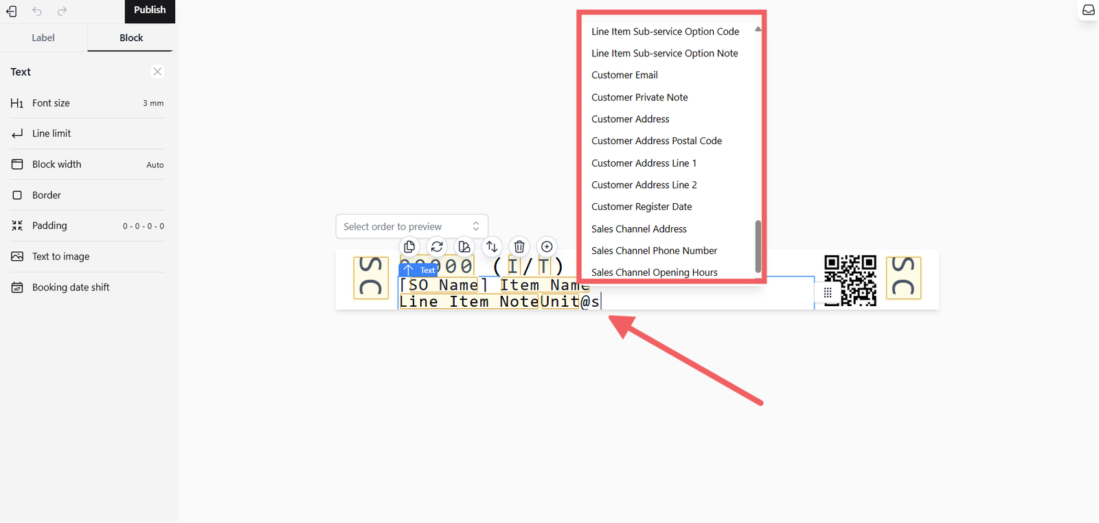 Use the preview bar at the top to select a real Order and Line Item (e.g., #1 Shirt). This allows you to test how dynamic data looks before publishing.