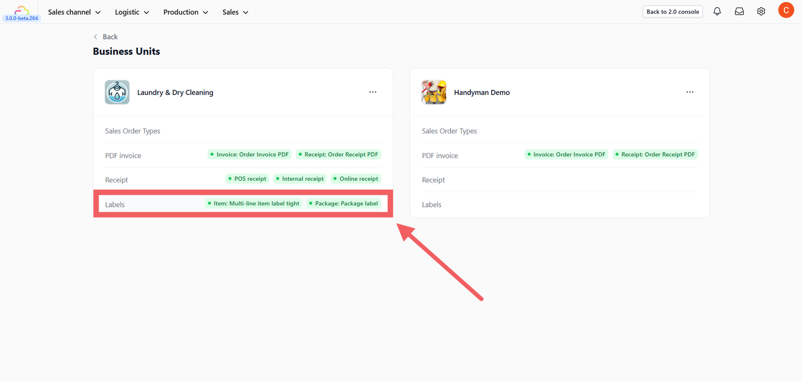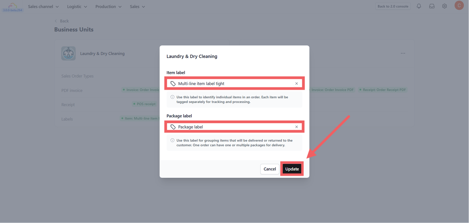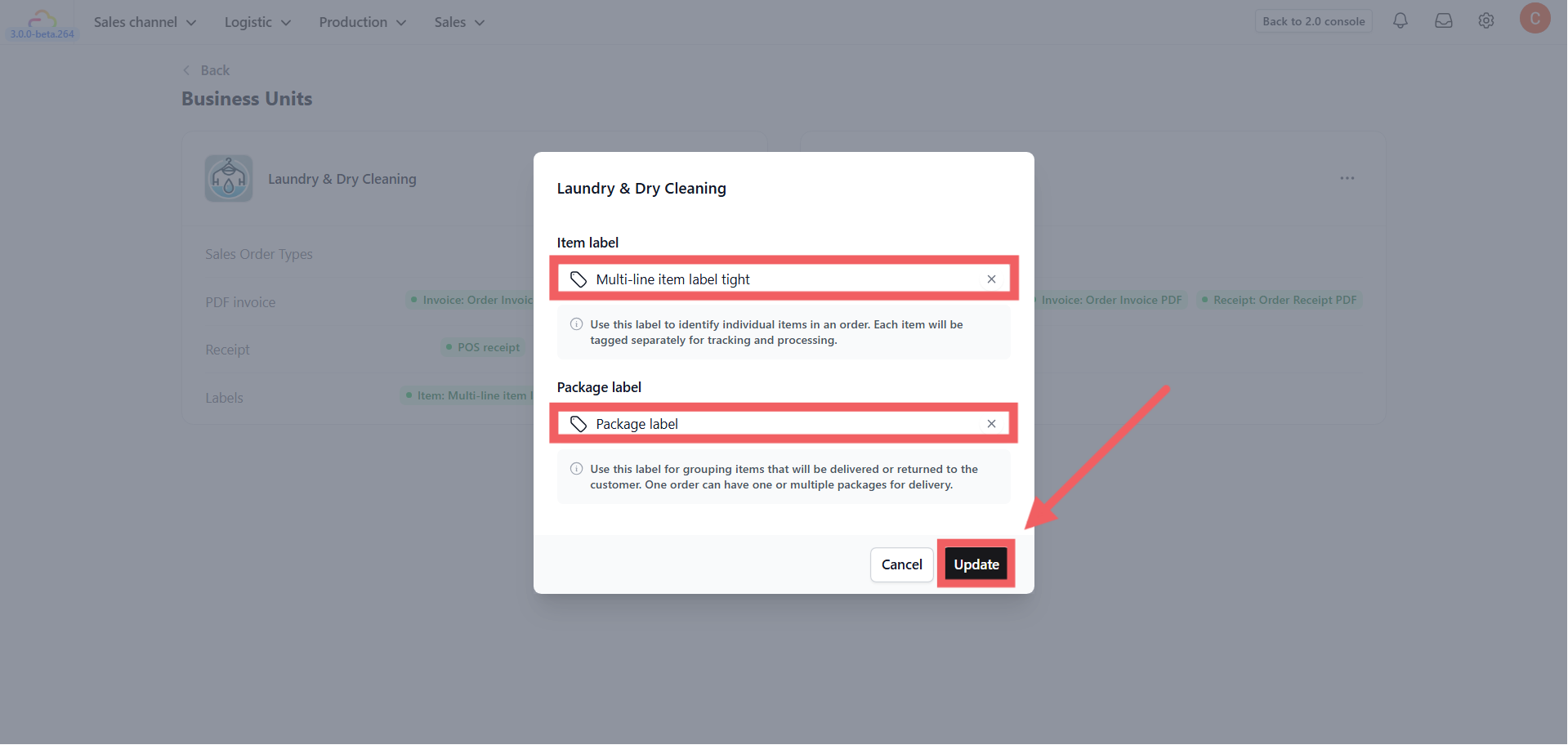 4. Click Update. Now, all orders under this business unit will use your new label design.