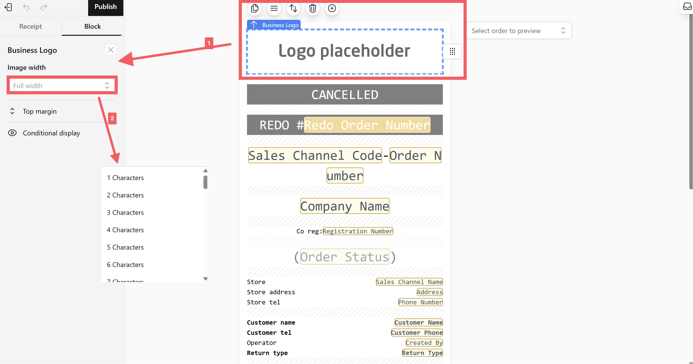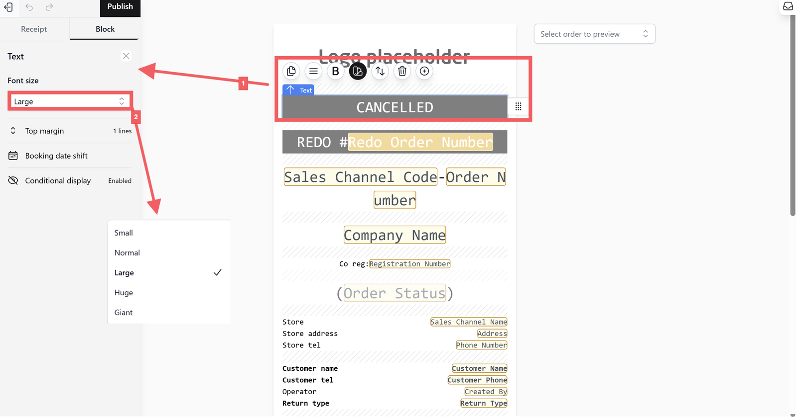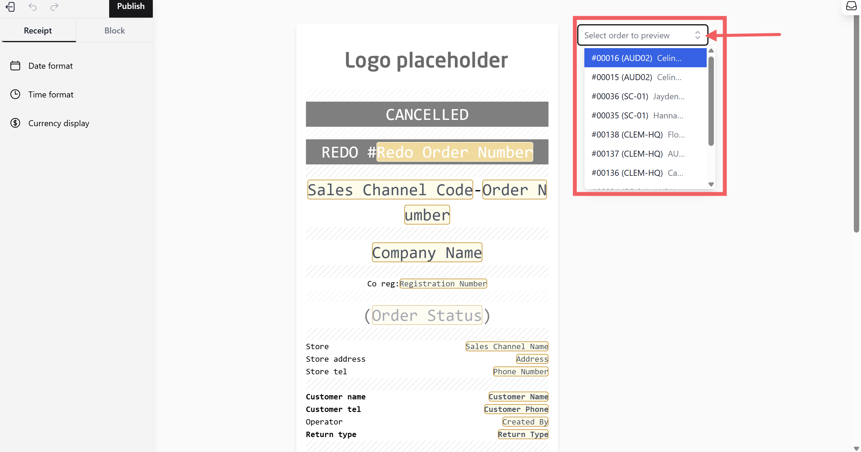 Click the Select order to preview bar at the top and select a real order to test how your layout handles actual data.