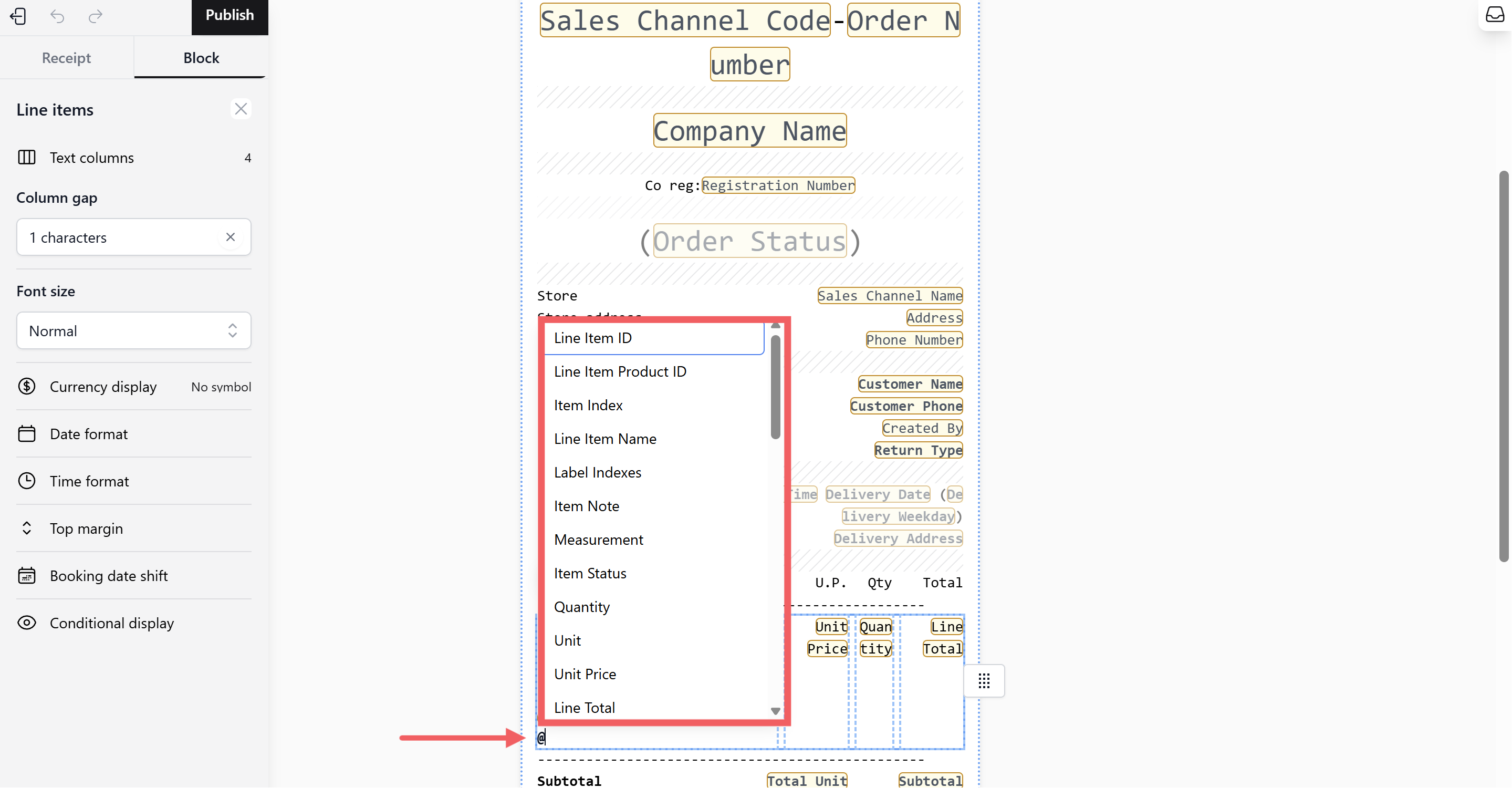 You can insert dynamic data that changes for every order by typing the @ symbol. This reveals a dropdown list of common variables, including: