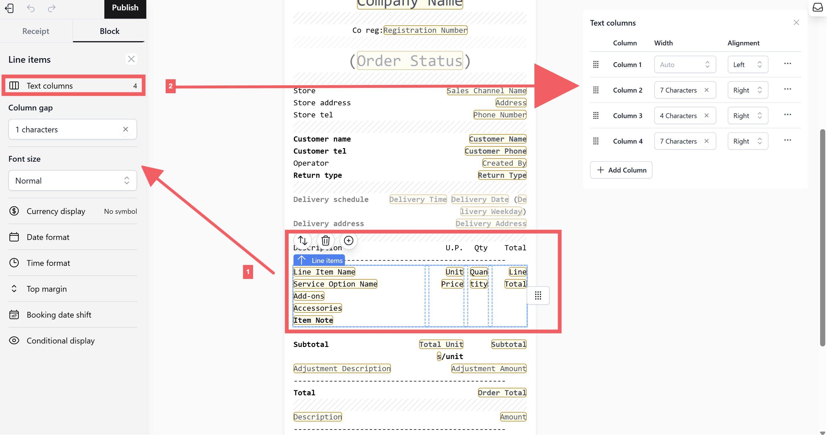 Use the left-side panel to configure the global settings for your receipt template.