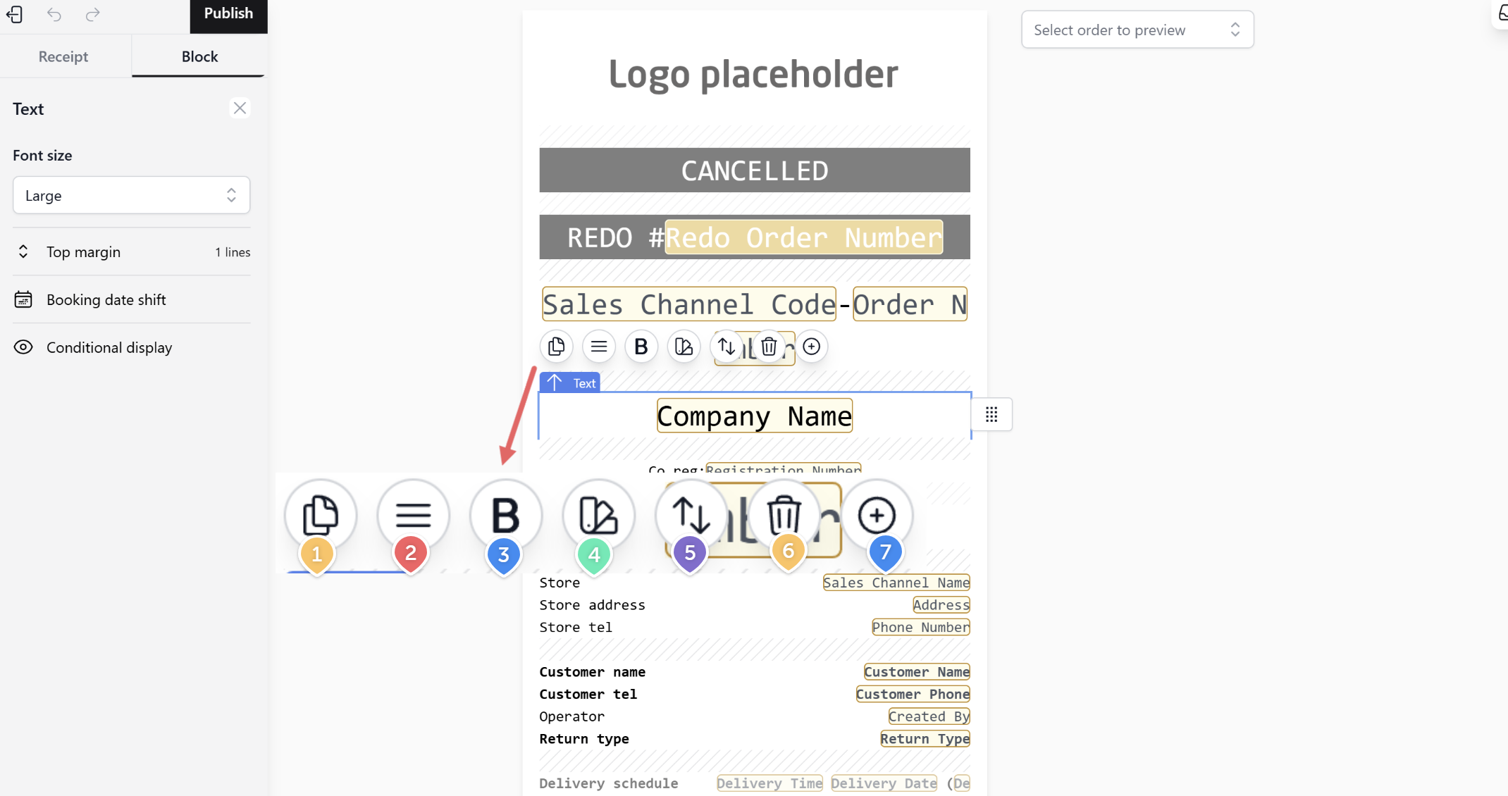 5. Move Block: Drag the block to a new position on the receipt.
