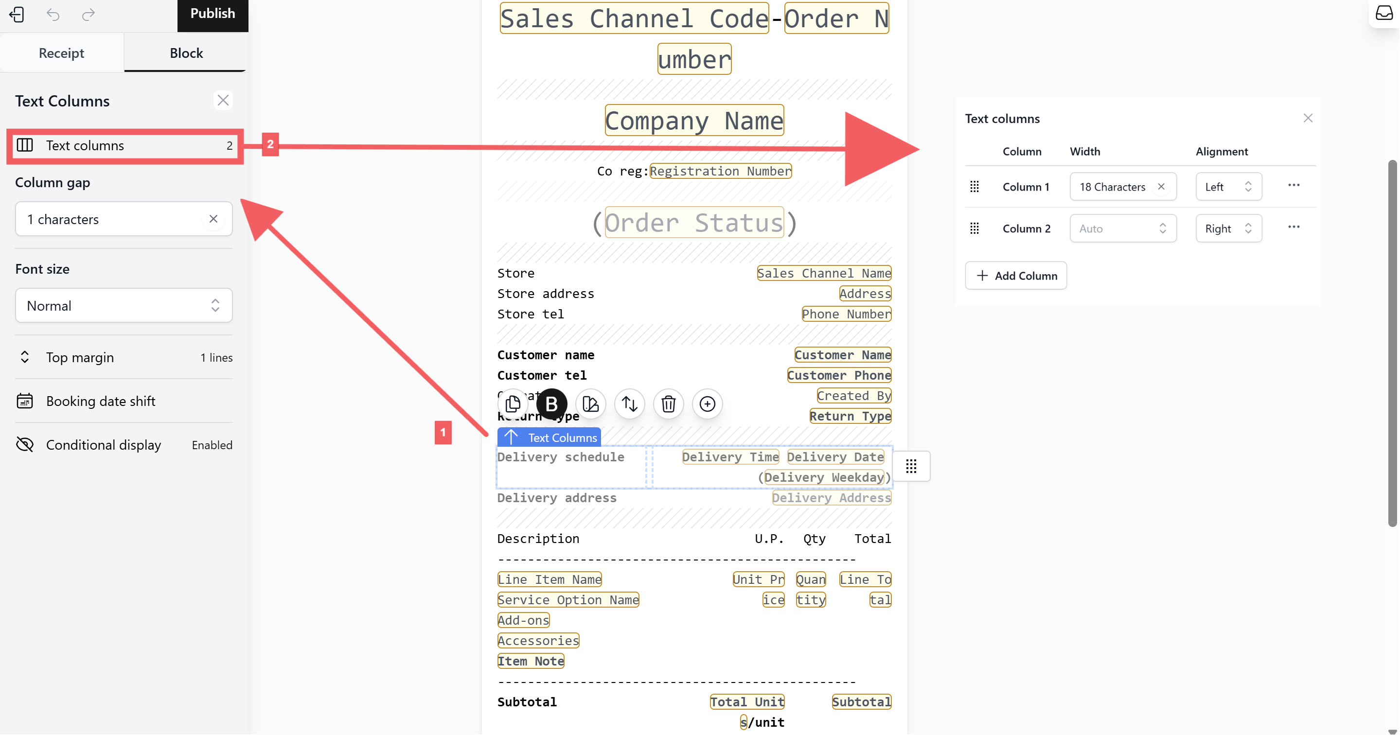 - Text Columns: Click here to set the number of columns, their width, and text alignment.