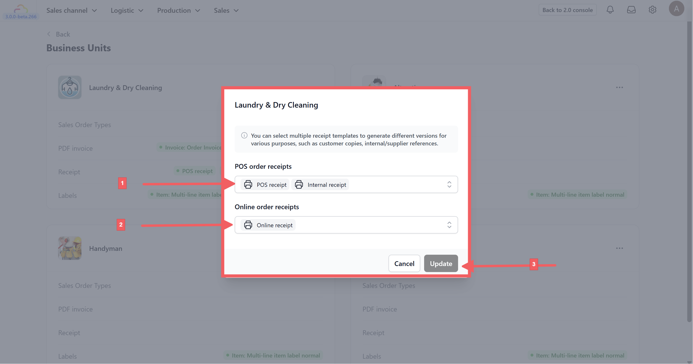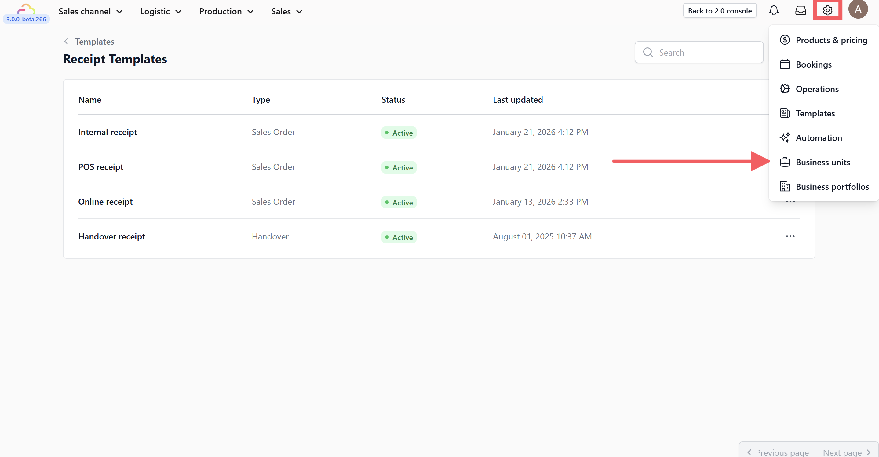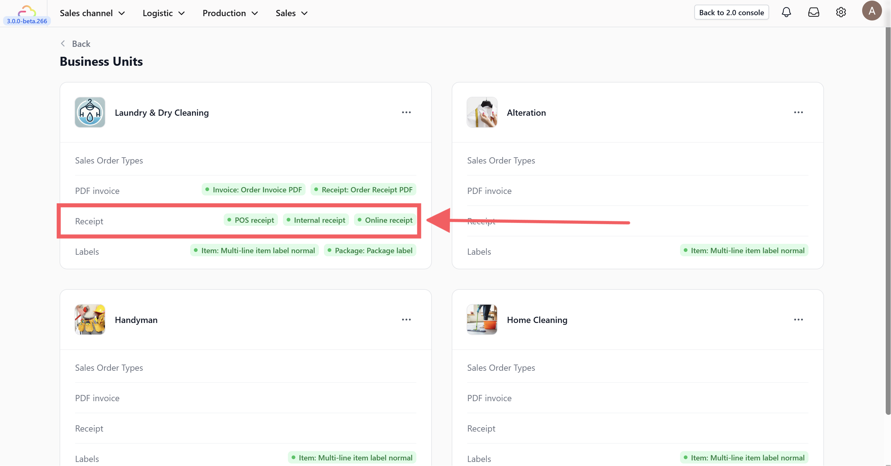 Choose the specific Business Unit (store) you want to update and click to the Receipts section.