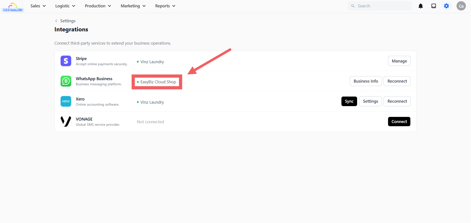 Once done, you'll be redirected back to EasyBiz and WhatsApp will show as connected with a green dot and your business name.