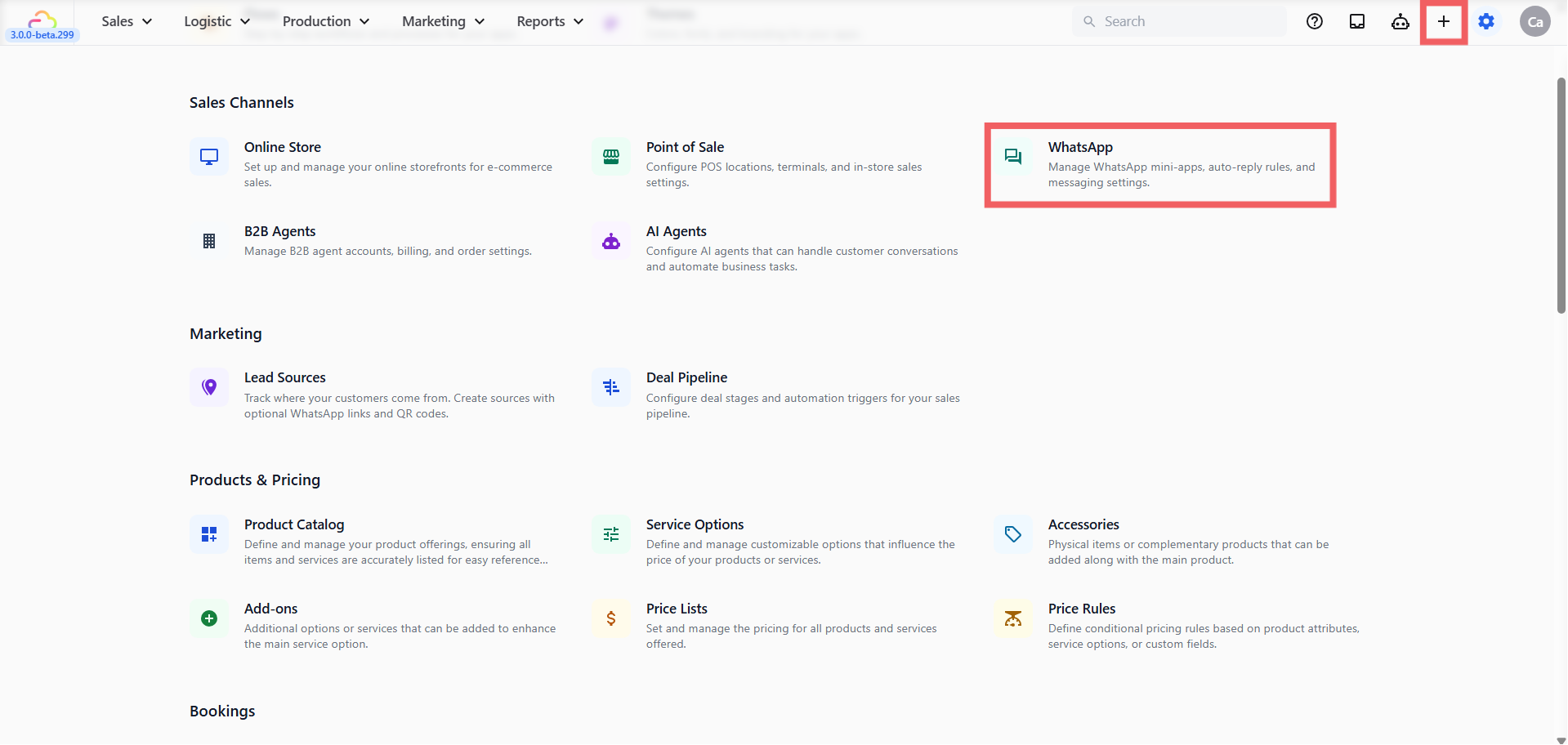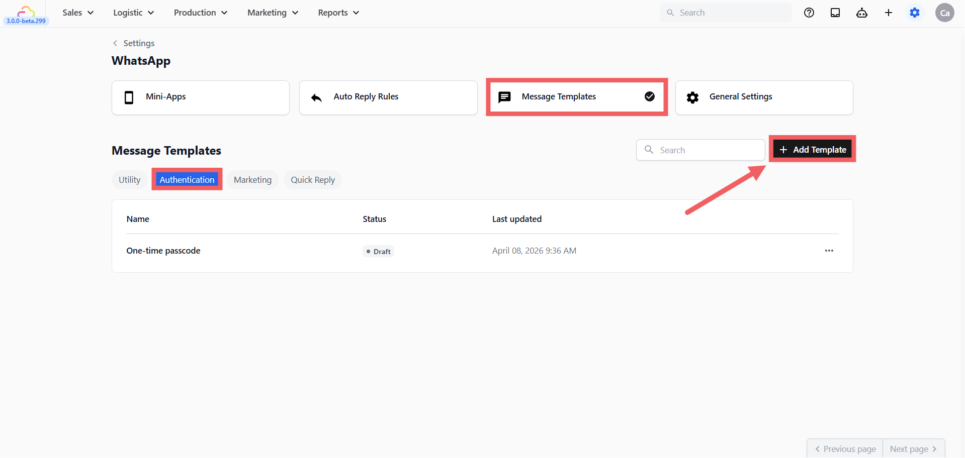 - Scroll down to the Sales Channels section and click WhatsApp, then click the Message Templates tab