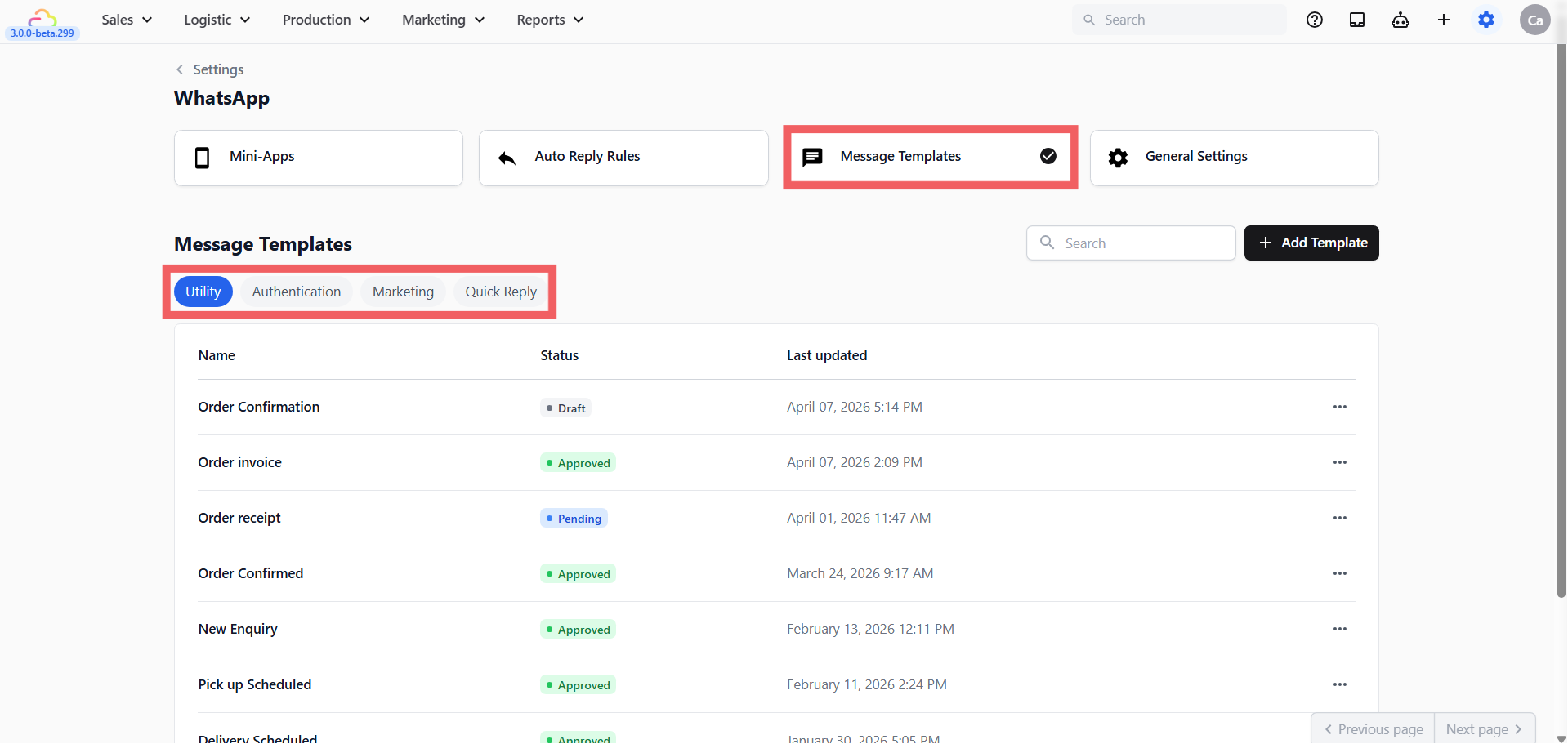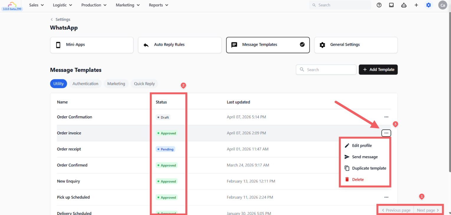 - Edit profile: Update the template's internal settings โ its name, which pipeline stage it moves a deal to, and the default reply status โ without reopening the full editor or going through Meta review.