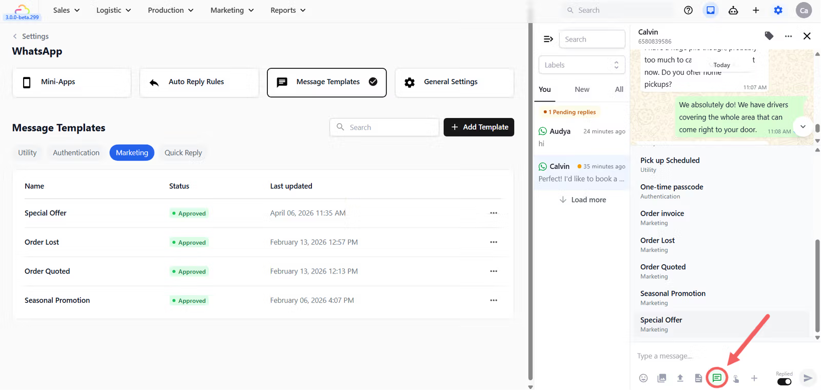 After submitting, you can return to the template list where the status will show as Pending. Once Meta approves it, the status will change to Approved and the template is ready to send to customers.