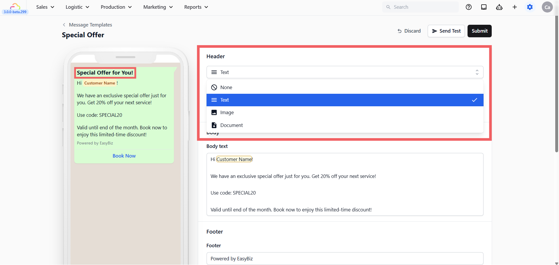- Special Offer -> Announce a discount or limited-time deal. Pre-written with a promotional message, coupon code, and a Book Now button.