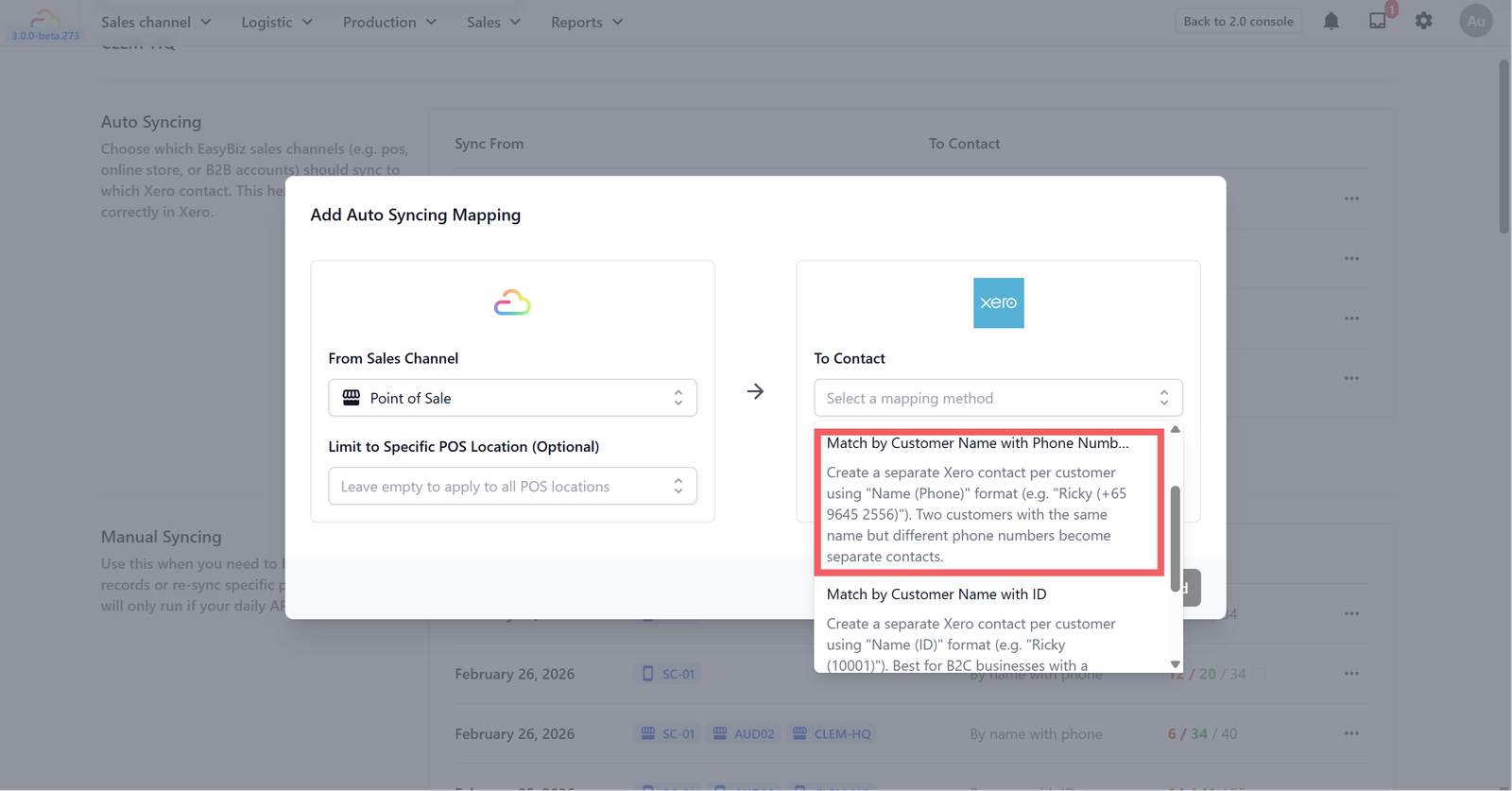 Contact matching is how EasyBiz decides which contact in Xero should receive the synced invoice. For example, if a customer named "John" places an order in EasyBiz, the system needs to find or create a matching contact in Xero to attach the invoice to. The method you choose determines how the system identifies that contact — by store name, phone number, customer ID, or a manually selected contact.