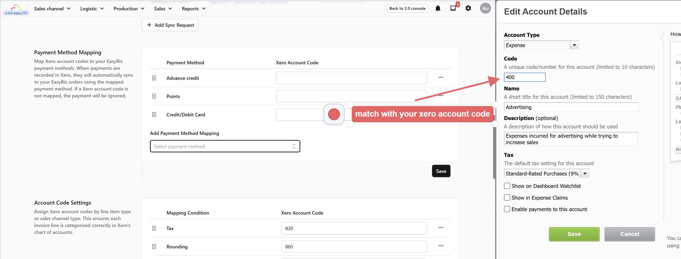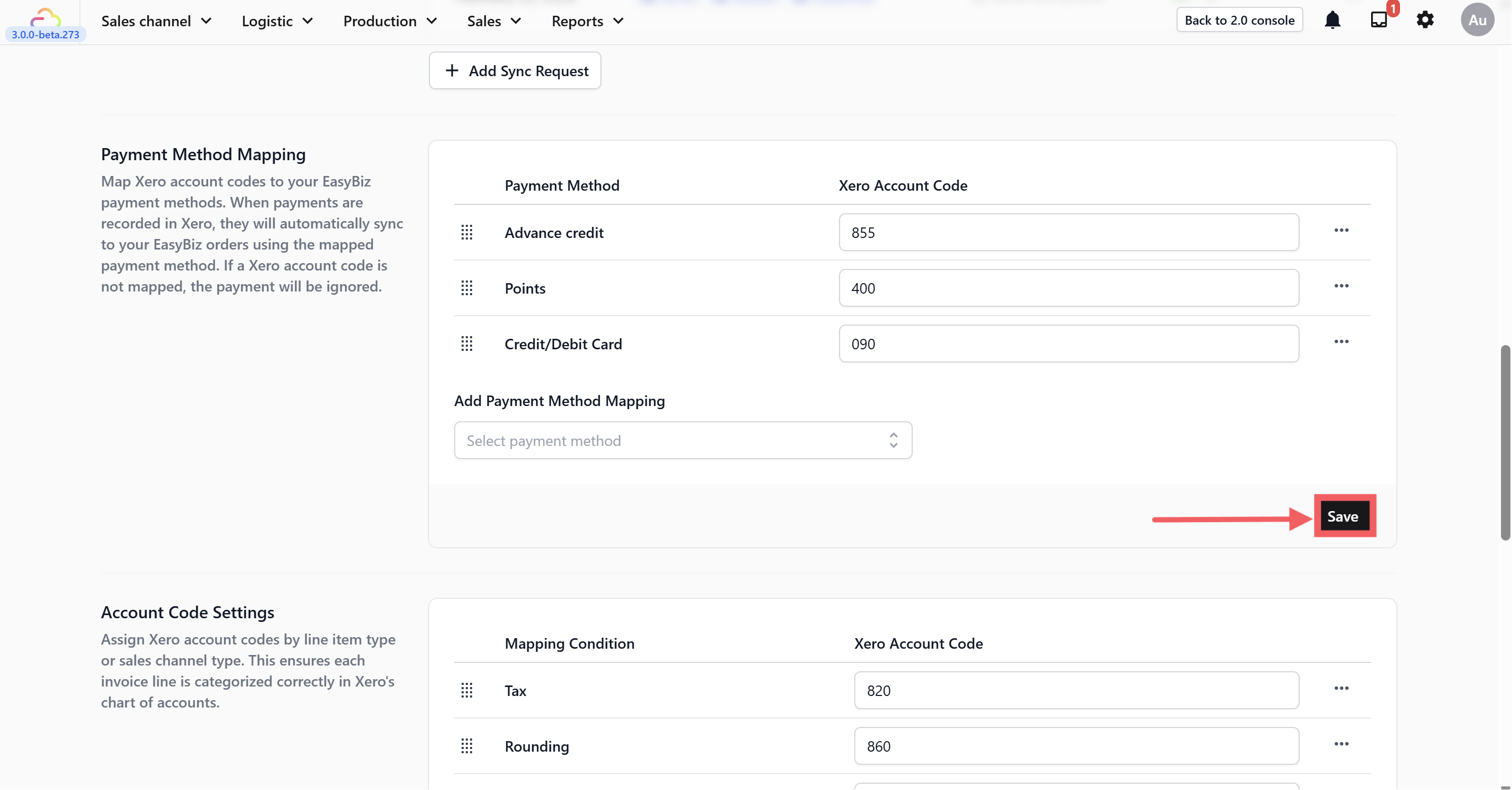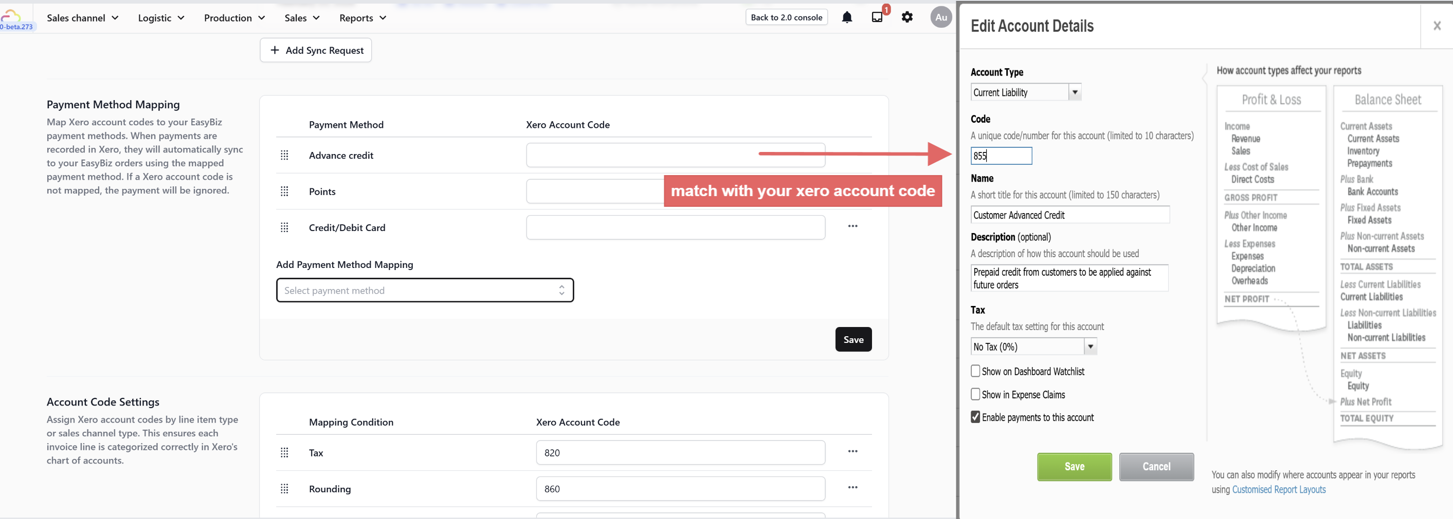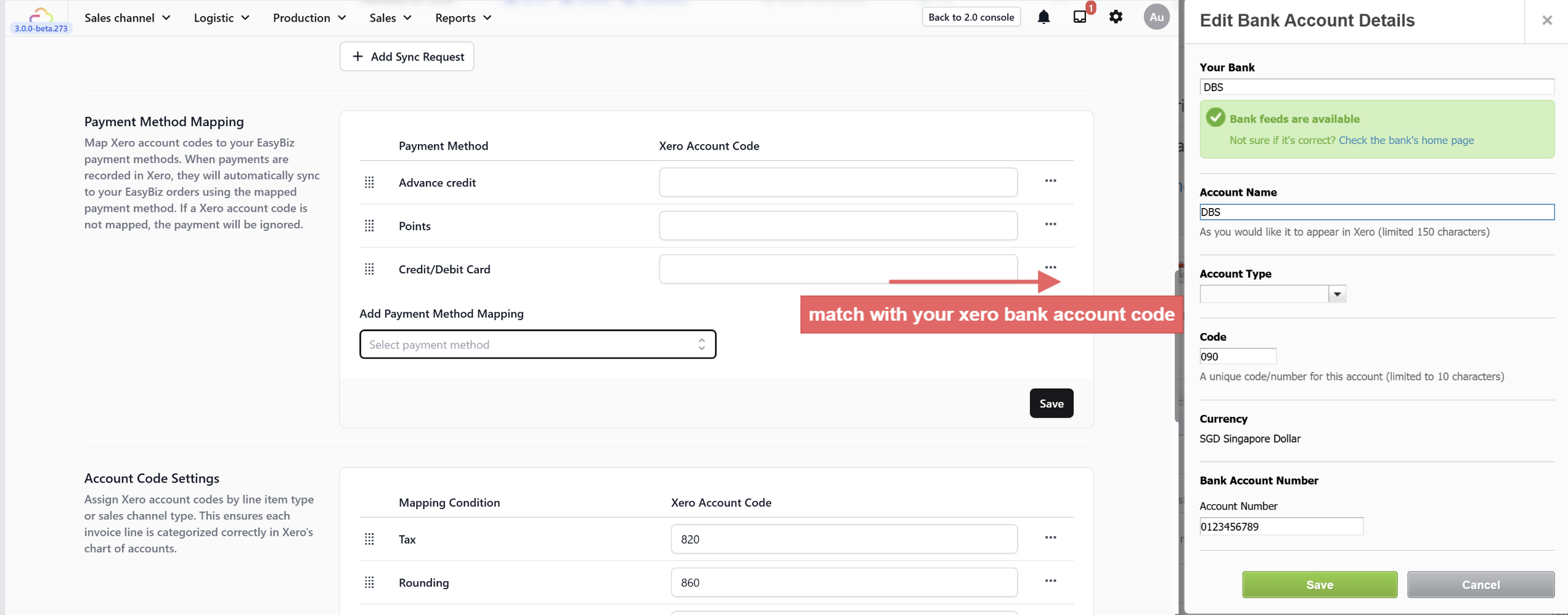 When a customer pays for an order in EasyBiz, the system records how they paid — whether it was by cash, credit card, QR code, or advance credit. But Xero does not automatically know where to record that payment. Without payment method mapping, Xero will not know which bank account or liability account the money belongs to, and your invoices may get stuck in the Awaiting Payment tab even though the customer has already paid.